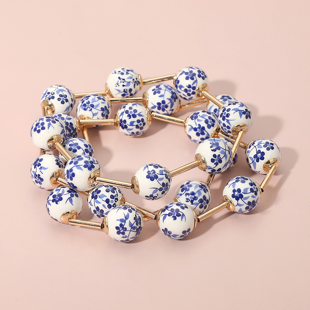 Details • Size : 1.5" H • Stretchable • Adorn your wrist with this blue floral bead bracelet set, showcasing delicate flower-patterned beads connected by gold accents. Lightweight and stylish, this versatile set brings a touch of artistic charm and feminine elegance to casual wear, garden parties, or seasonal fashion outfits. • Lead and Nickel Compliant