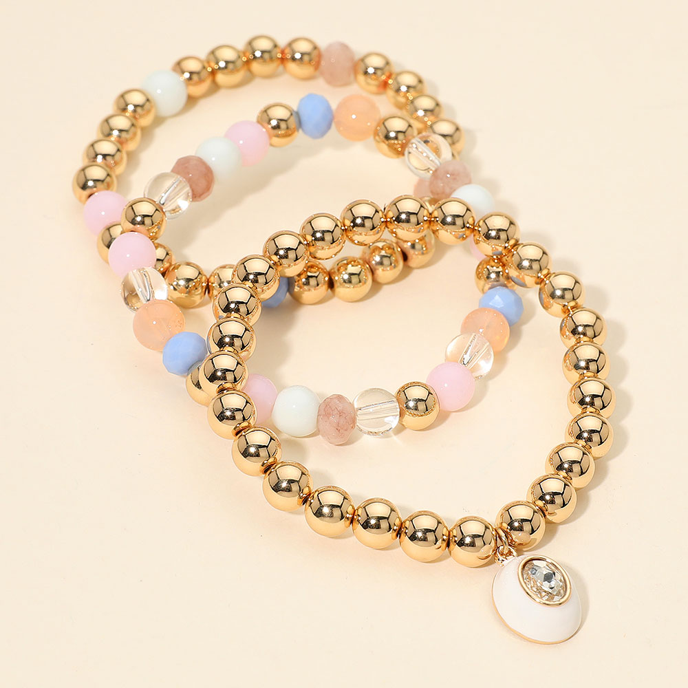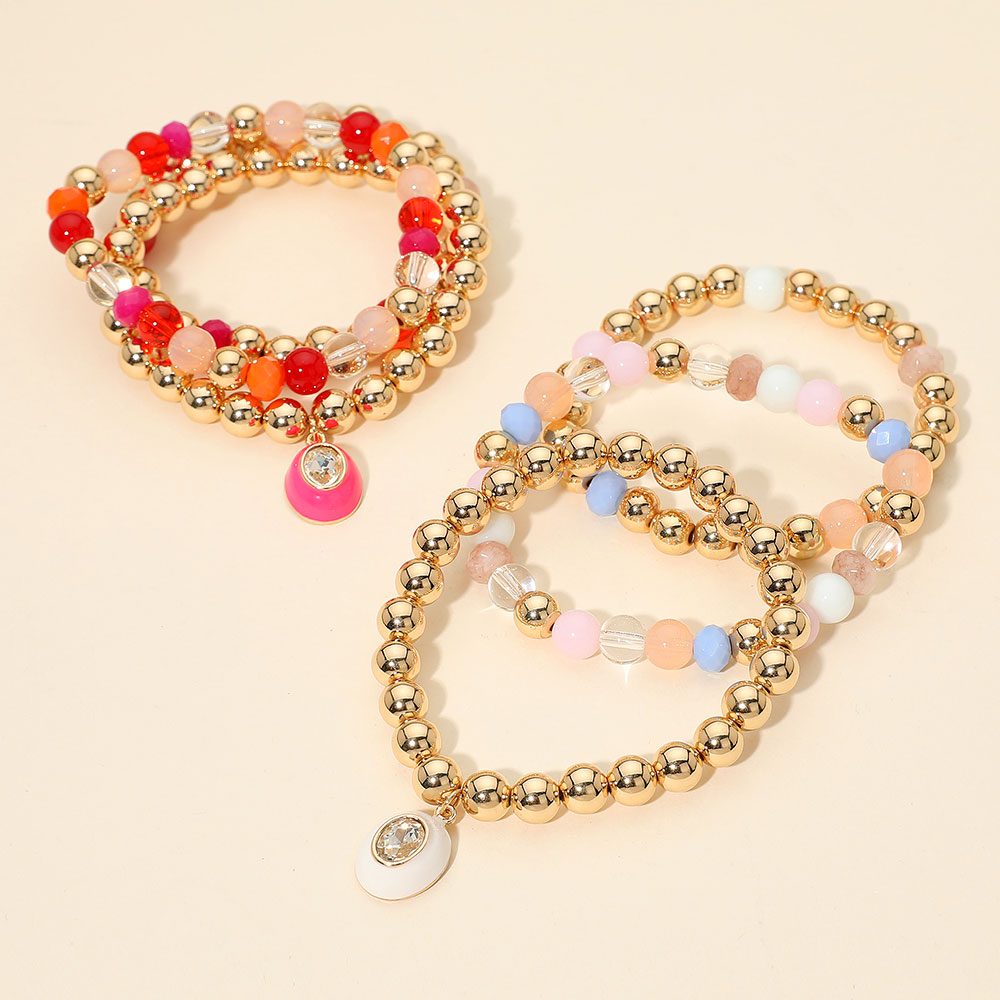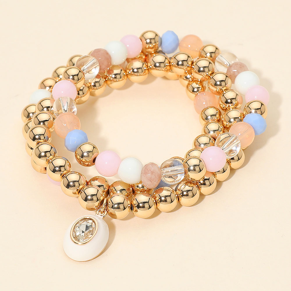 3PCS - Oval Stone Charm Ball Beaded Stretch Multi Layered Bracelets