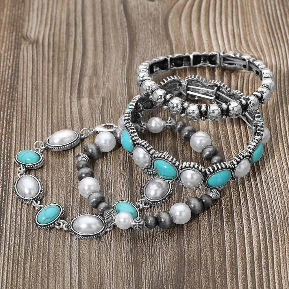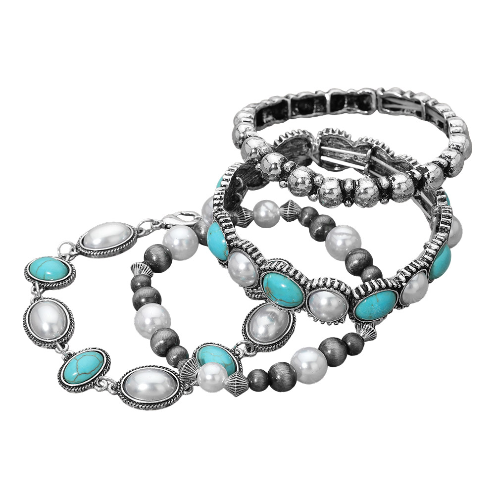 4PCS - Boho Oval Round Stone Pearl Embellished Stretch Multi Layered Bracelets