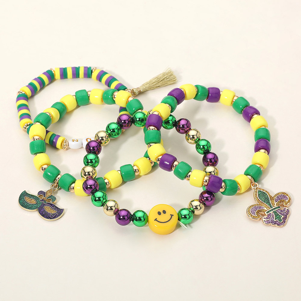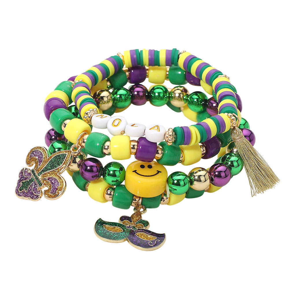 4PCS - Mardi Gras Eye Mask Fleur de Lis Charm Smile Beaded Stretch Multi Layered Bracelets
