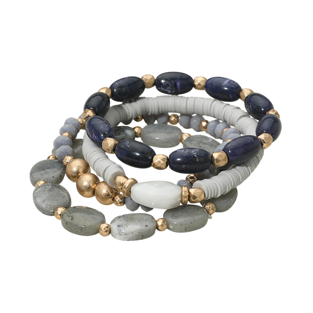 Details • Size : 1.5" H • Stretchable • This layered stretch bracelet set features a unique mix of smooth, faceted, and textured beads combined with metallic accents. Designed for easy wear and versatile styling, this multi-strand bracelet stack adds a bold yet elegant finishing touch to casual and dressy looks. • Lead and Nickel Compliant