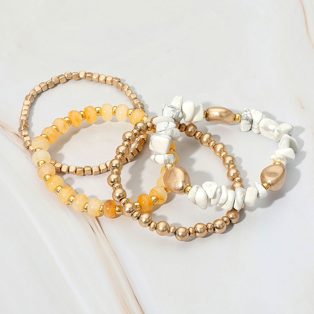 • This set of four beaded stretch bracelets features a mix of natural stone chips, smooth beads, and metallic accents for a layered boho-chic look. Comfortable and versatile, they can be worn together or separately to complement a variety of casual and stylish outfits.