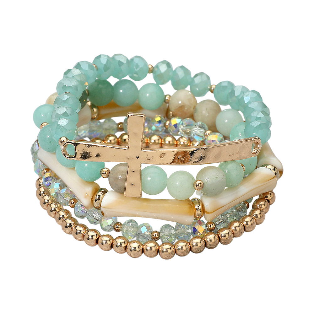 5PCS - Metal Cross Accent Resin Bamboo Bar Faceted Beaded Stretch Multi Layered Bracelets