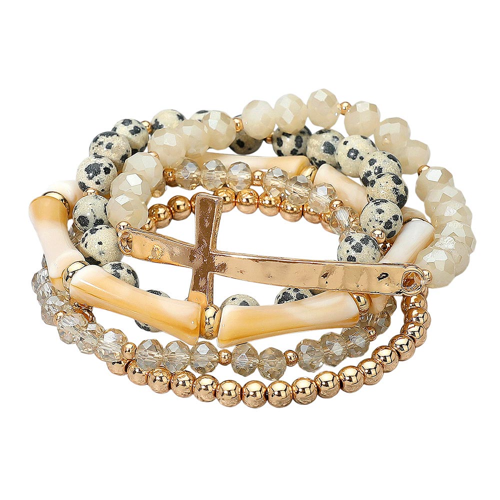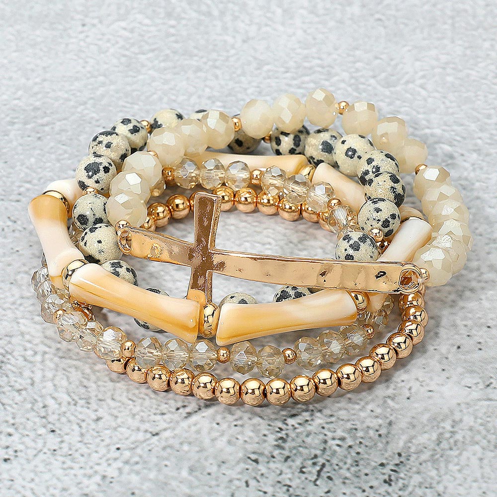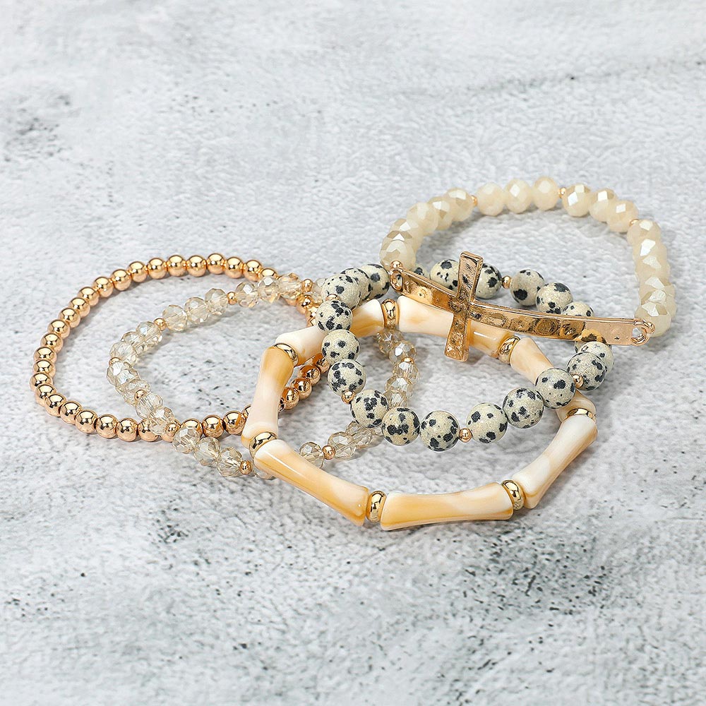 5PCS - Metal Cross Accent Resin Bamboo Bar Faceted Beaded Stretch Multi Layered Bracelets