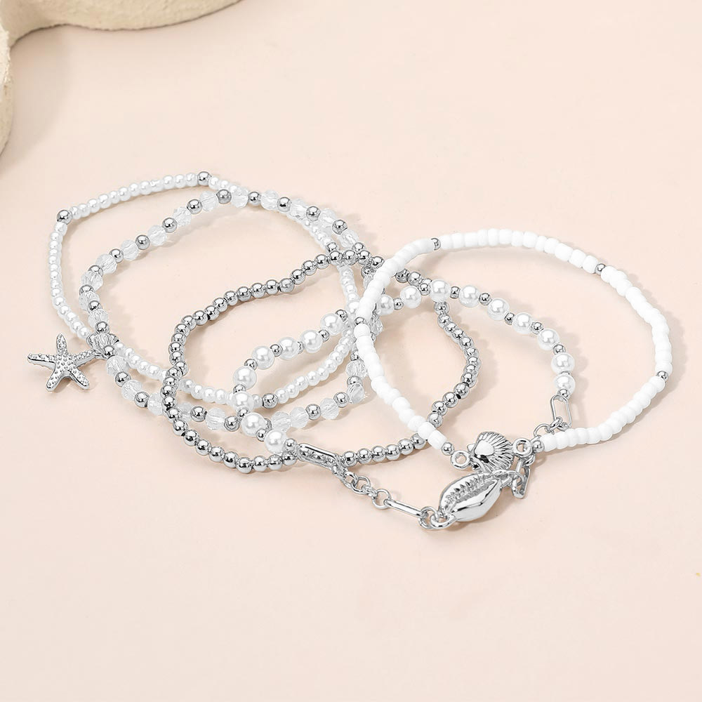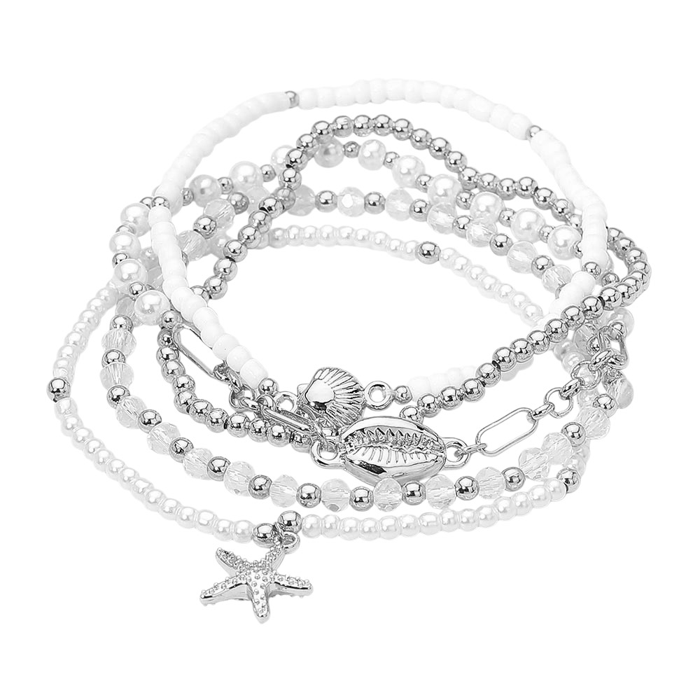 Details • Size : 0.75" H • Stretchable • Bring seaside elegance to your style with this Ocean Charm Beaded Layered Bracelet Set. Featuring shells, pearls, and starfish accents, this five-piece stack creates a playful coastal look. Ideal for adding a breezy, beach-inspired touch to casual or summer outfits. • Lead and Nickel Compliant