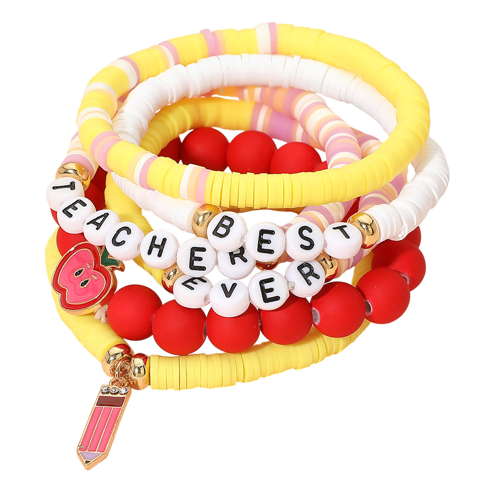 6PCS - BEST TEACHER EVER Message Pencil Apple Charm Heishi Beaded Stretch Multi Layered Bracelets