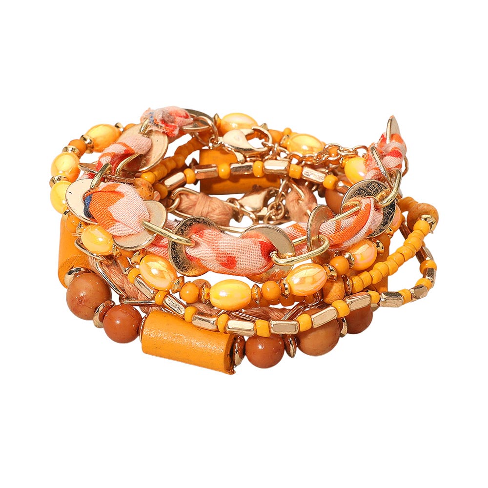 • Boho beaded layer bracelet set featuring multi-strand design with textured beads, fabric-wrapped accents, and metallic details for a handcrafted artisan style. Perfect for stacking and adding a trendy, relaxed vibe to everyday outfits, festival looks, vacations, and thoughtful gifting occasions.