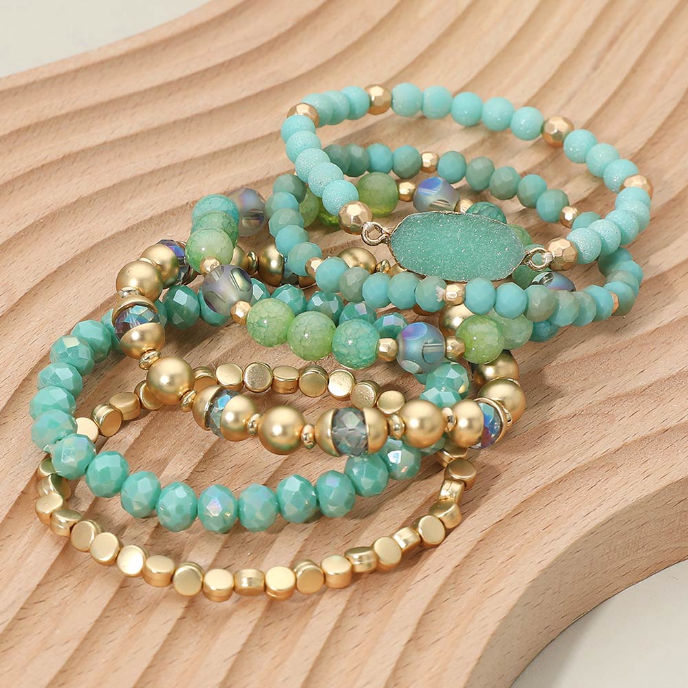 6PCS - Oval Druzy Charm Accent Faceted Beaded Stretch Multi Layered Bracelets