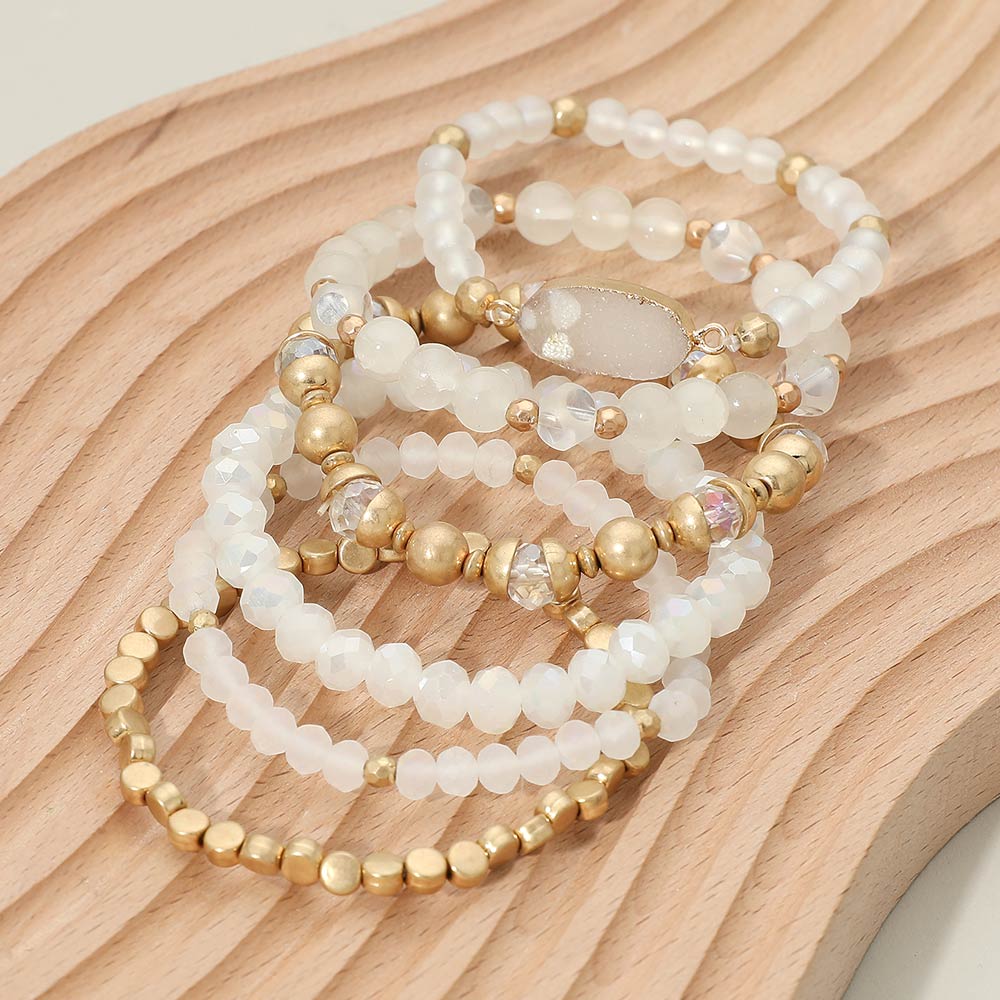 6PCS - Oval Druzy Charm Accent Faceted Beaded Stretch Multi Layered Bracelets