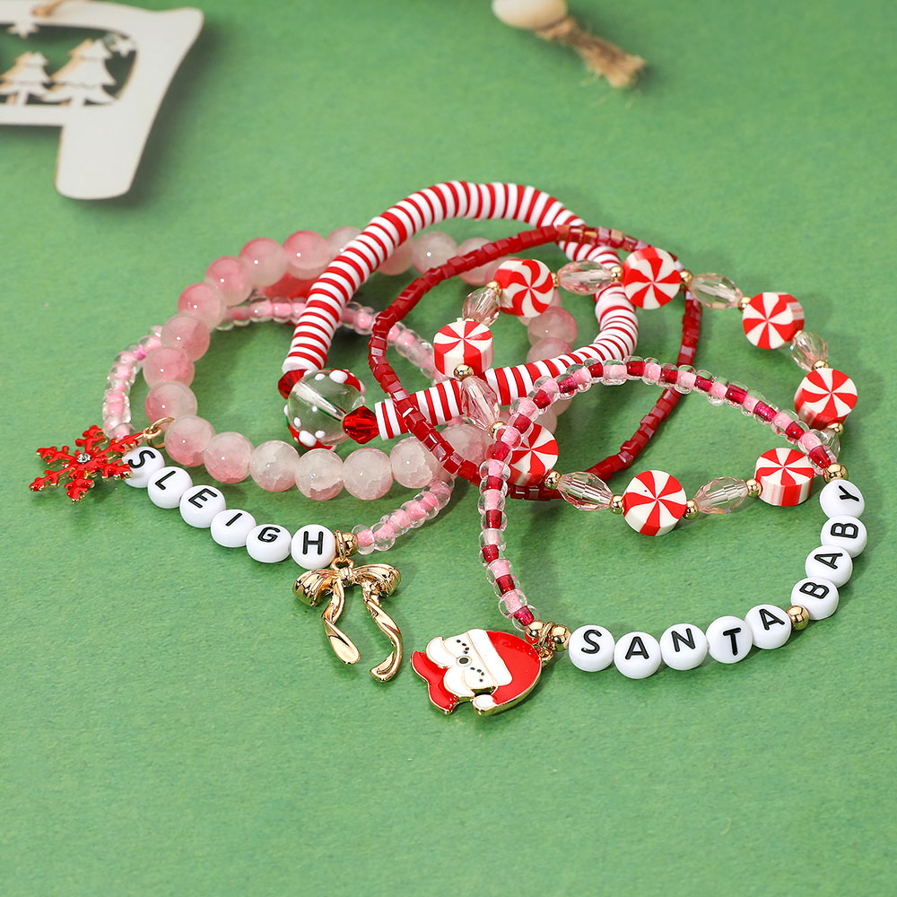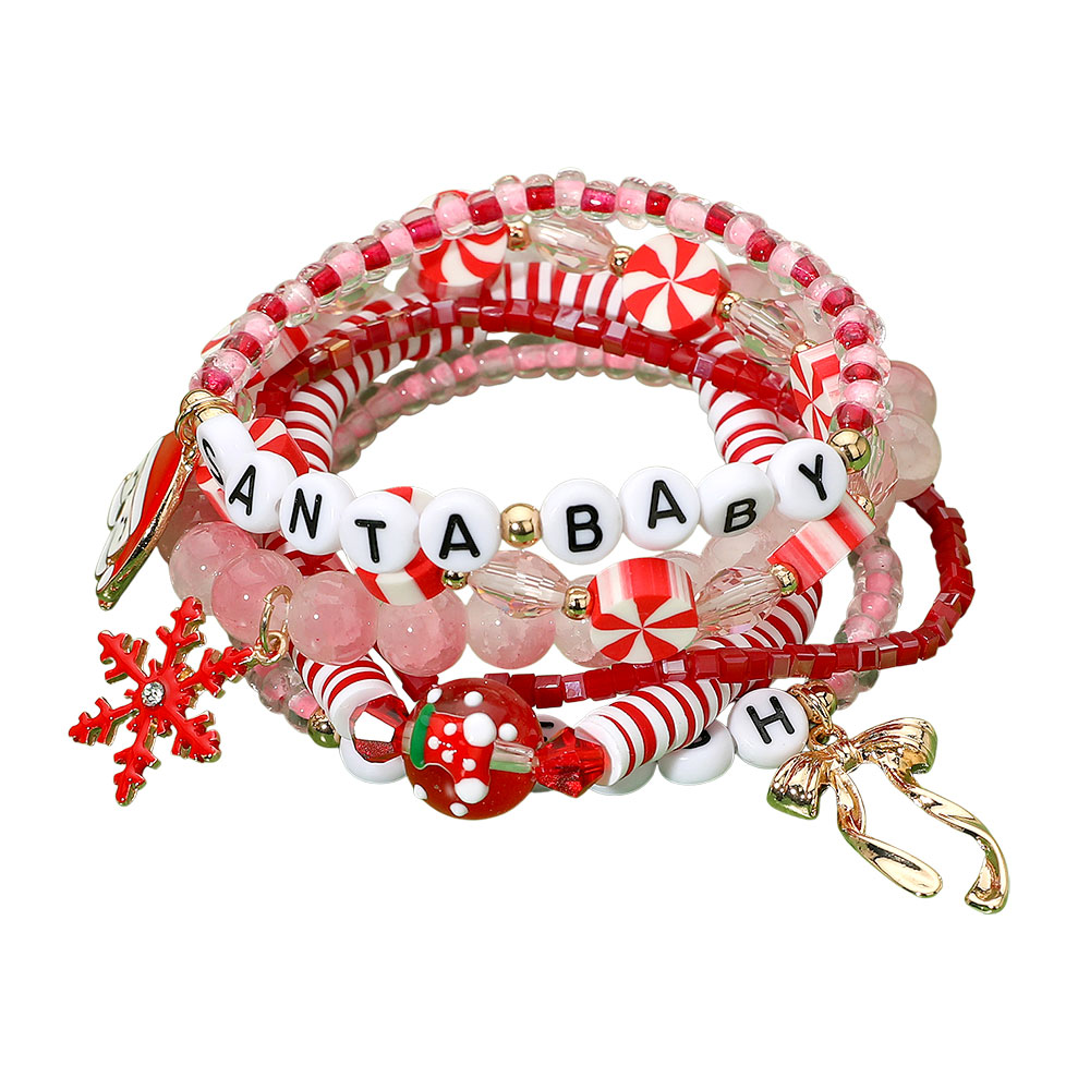 Details • Size : 1.5" H • Stretchable • Festive coil bracelet set with holiday beads, candy cane accents, and playful charms including snowflake, bow, and Santa Baby letters. A cheerful accessory perfect for holiday outfits, parties, and gifting. • Lead and Nickel Compliant