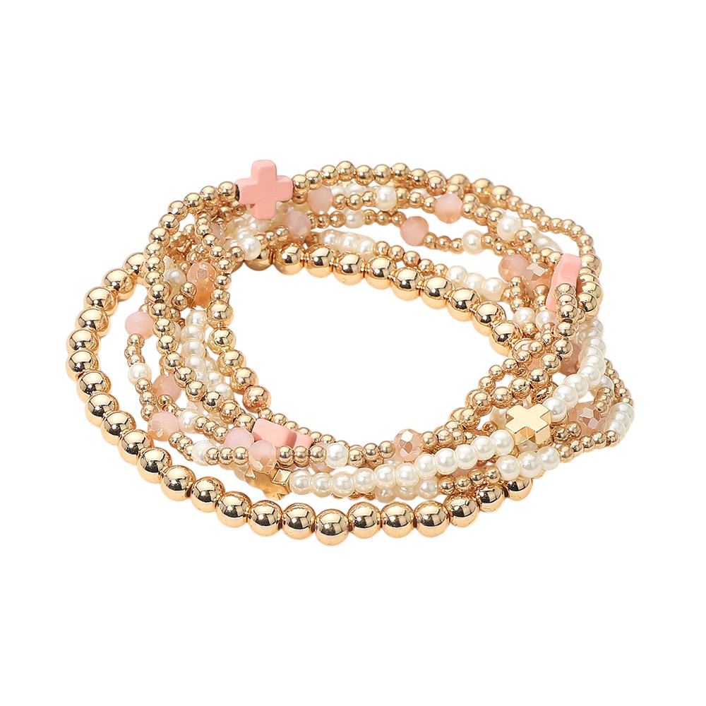 7PCS - Cross Pearl Metal Ball Beaded Stretch Multi Layered Bracelets