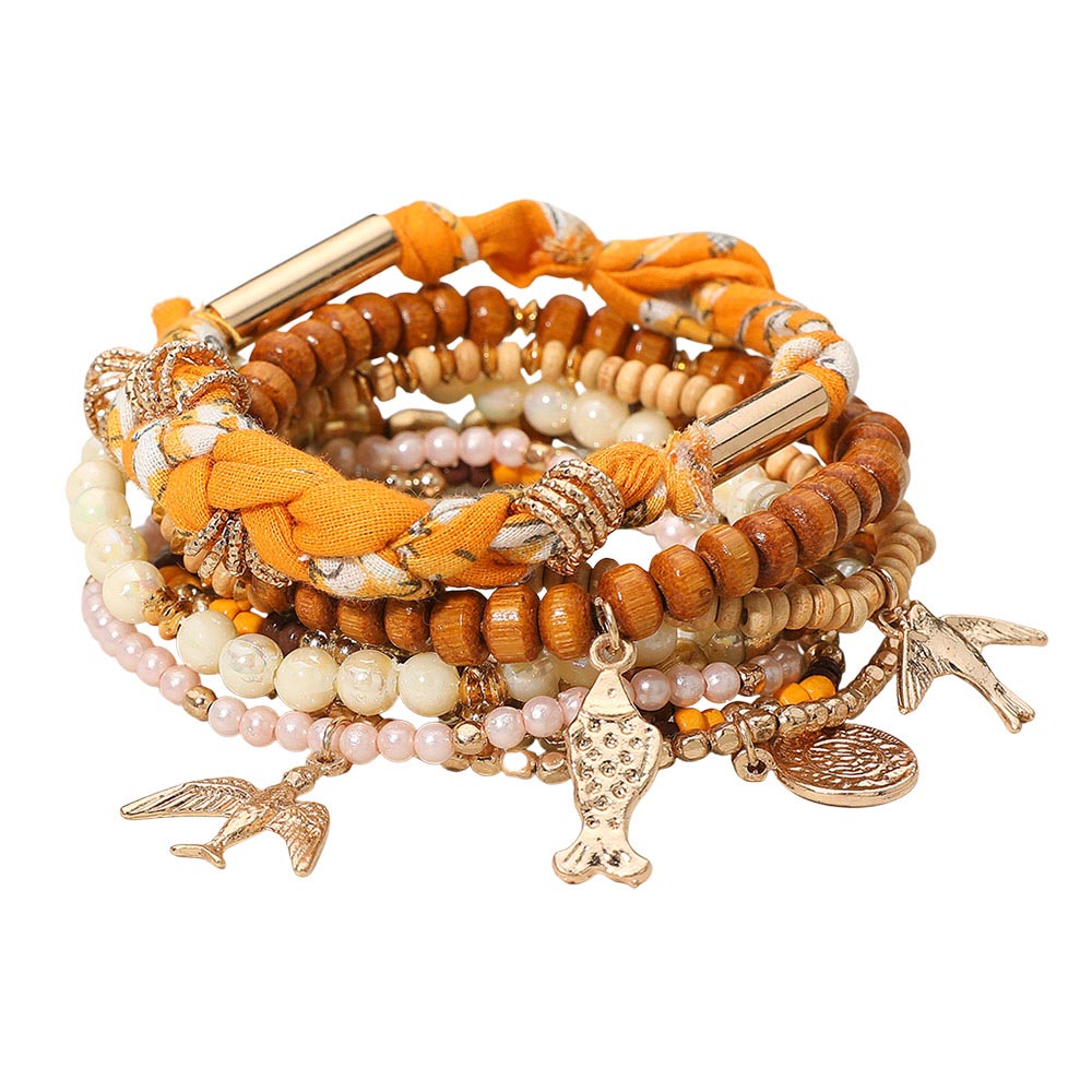 Details • Size 1 : 1.5" H / Stretchable • Size 2 : 0.5" H, 7" + 1.5" L / Lobster Clasp Closure • Boho charm bracelet set featuring layered beaded strands with fish and bird motifs, wood-style accents, fabric-wrapped details, and metallic highlights for a handcrafted artisanal look. Perfect for stacking, casual outfits, vacations, festivals, and gifting, adding a relaxed coastal vibe to everyday style. • Lead and Nickel Compliant • Made In India