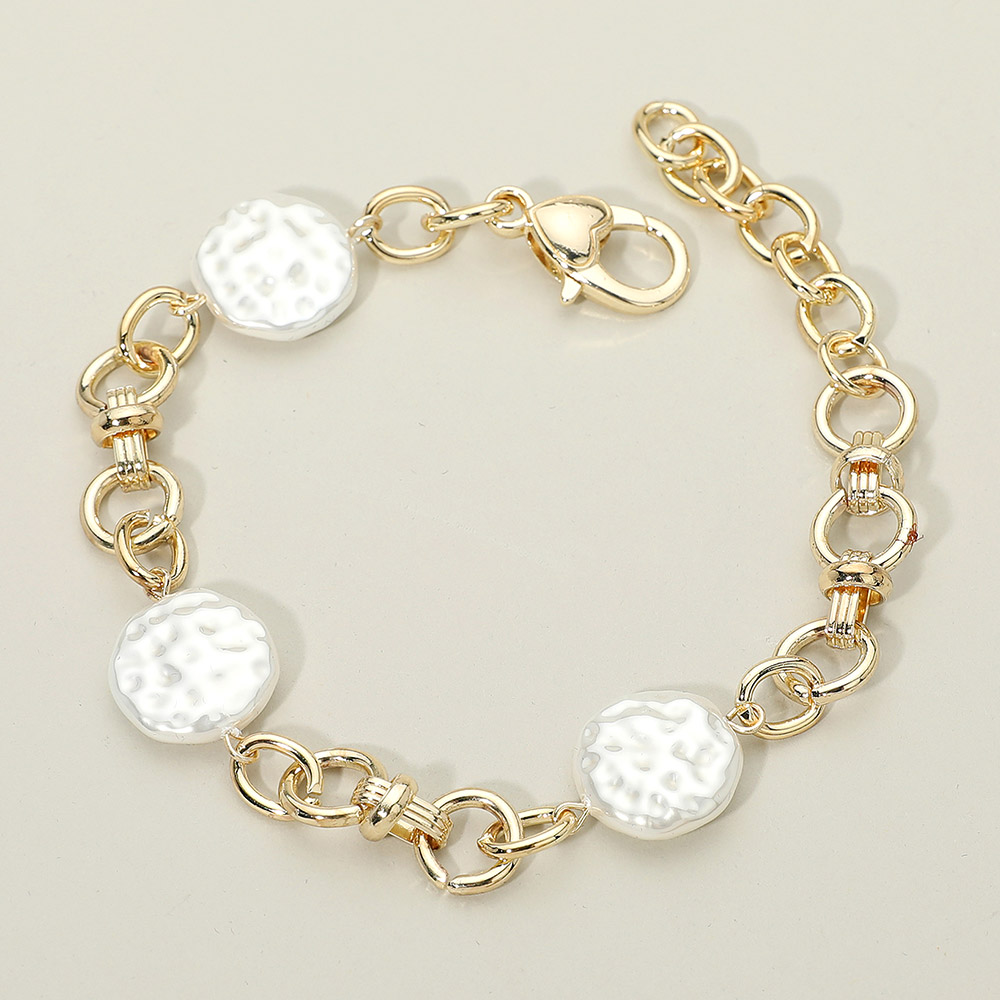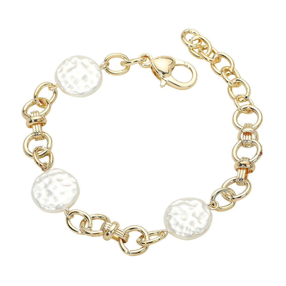Details • Size : 0.7" H, 8" + 2" L • Lobster Clasp Closure • Modern chain bracelet accented with textured pearl disc beads for a balanced mix of classic and contemporary style. Designed for easy everyday wear, this bracelet layers effortlessly with other favorites or stands out worn alone. A versatile accessory choice for boutiques looking to offer timeless designs with broad customer appeal. • Gold Dipped