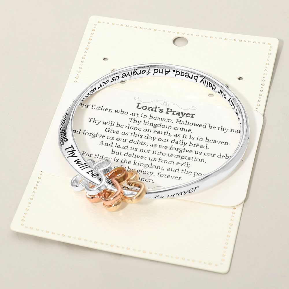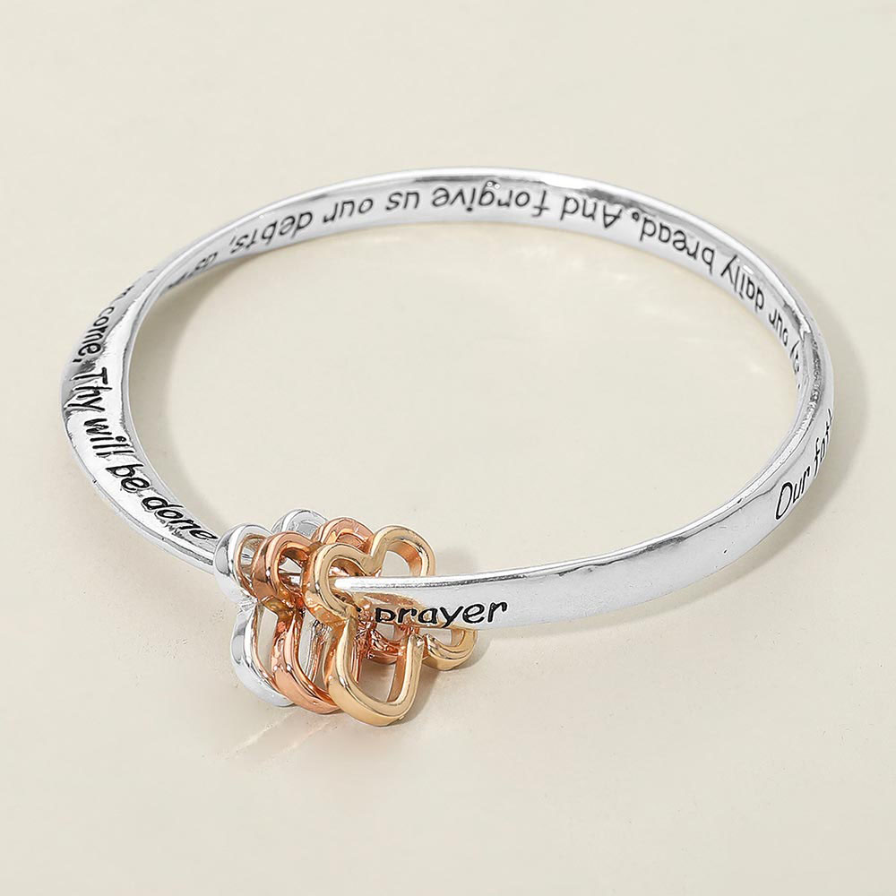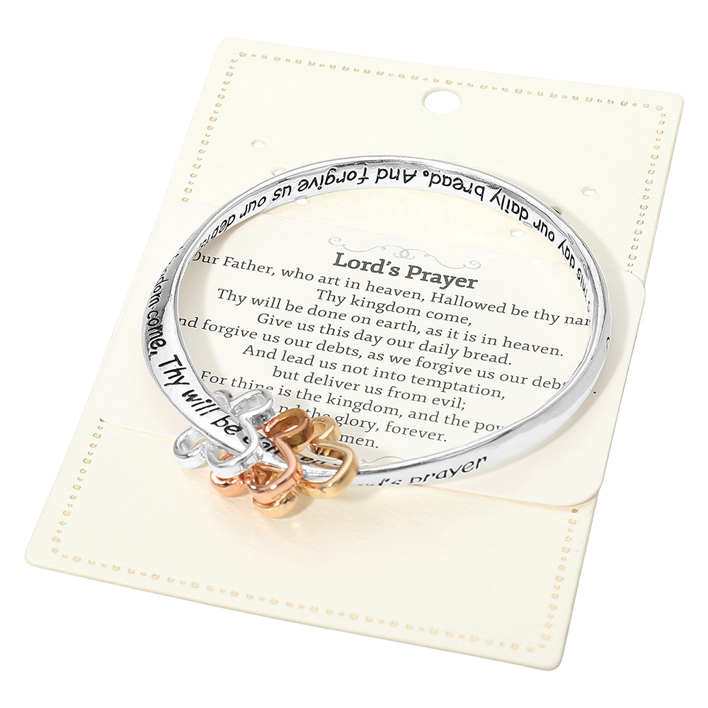 Details • Size : 0.75" H, 2.5" D • Carry daily inspiration with this engraved Lord’s Prayer bangle bracelet featuring a meaningful faith message and elegant accent rings. A versatile accessory ideal for everyday wear or heartfelt gifting, offering a timeless way to reflect personal beliefs with subtle style. • Lead and Nickel Compliant