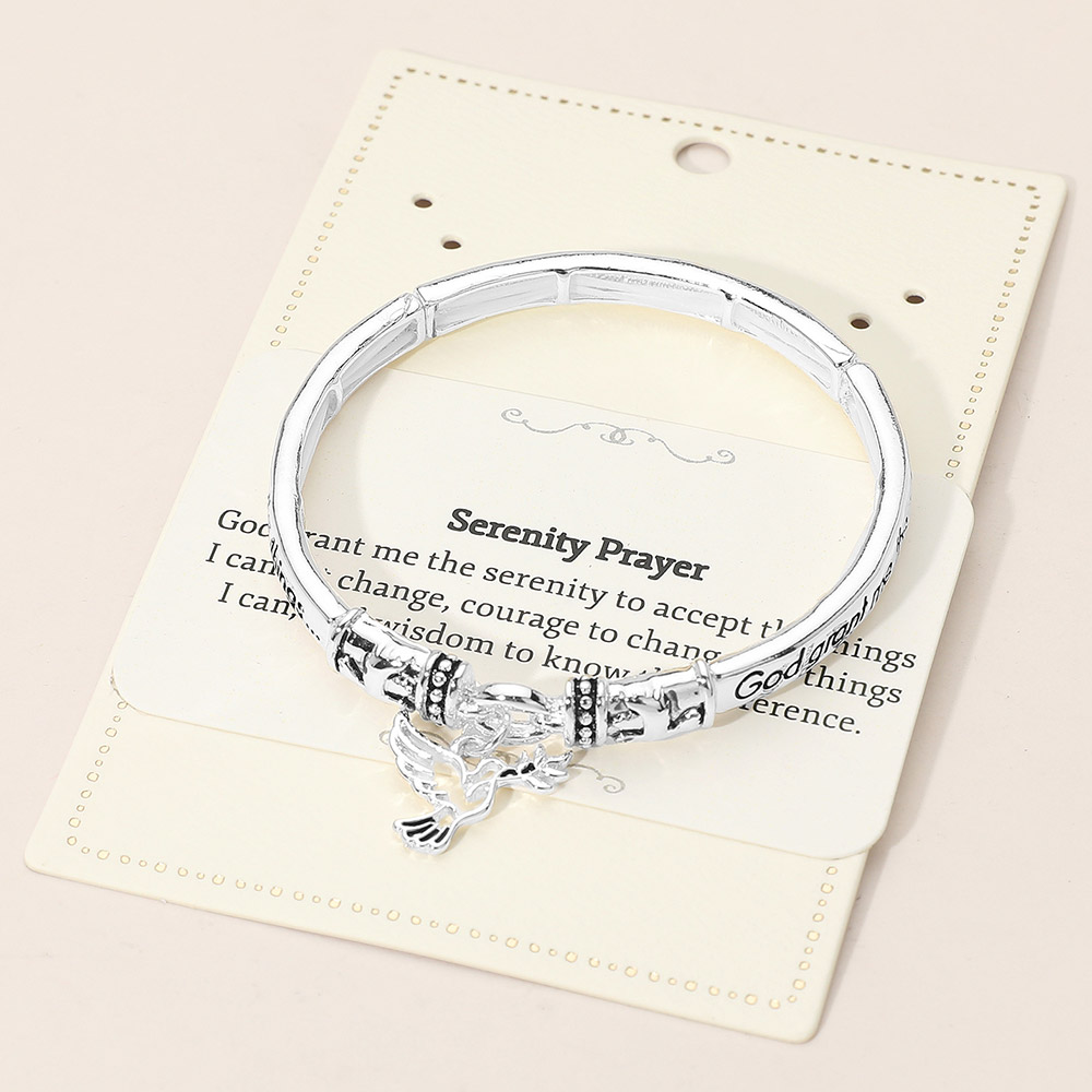 Details • Size : 0.25" H, 2.4" D • Charm Size : 0.6" L • Stretchable • Embrace peace and faith with this elegant bangle bracelet featuring the Serenity Prayer and a symbolic dove charm. Designed to inspire calm and courage, it serves as a daily reminder of wisdom and inner strength, making it a meaningful gift or personal keepsake for spiritual reflection. • Lead and Nickel Compliant