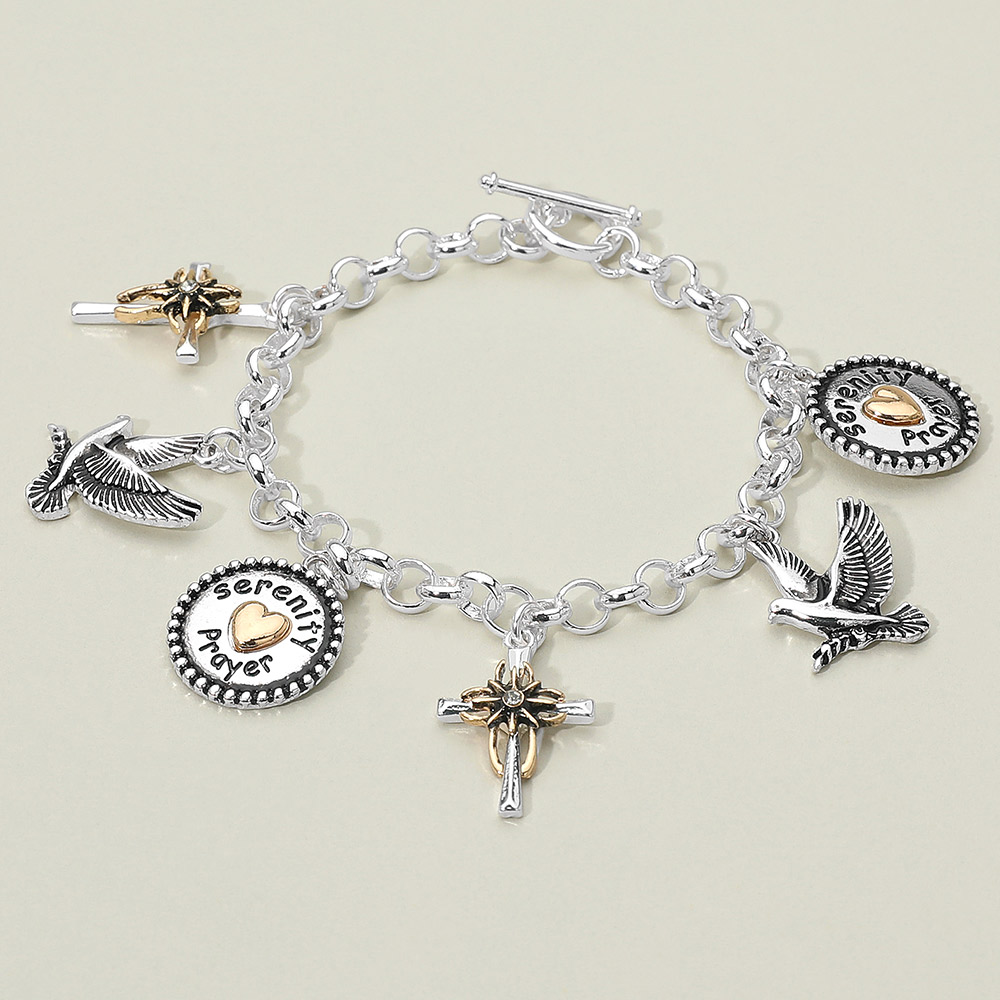 Details • Size : 1.1" H, 7.5" L • Toggle Closure • Embrace peace and faith with this Serenity Prayer charm bracelet, featuring symbolic charms of hope and devotion. The engraved message inspires courage and wisdom, making it a meaningful accessory or thoughtful gift for anyone seeking daily encouragement and spiritual strength. • Lead and Nickel Compliant