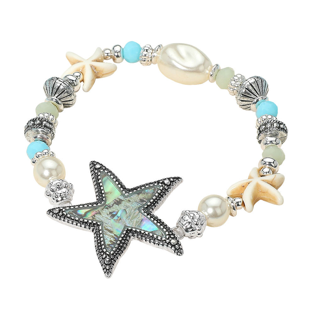Abalone Antique Metal Starfish Pearl Beaded Stretch Bracelet