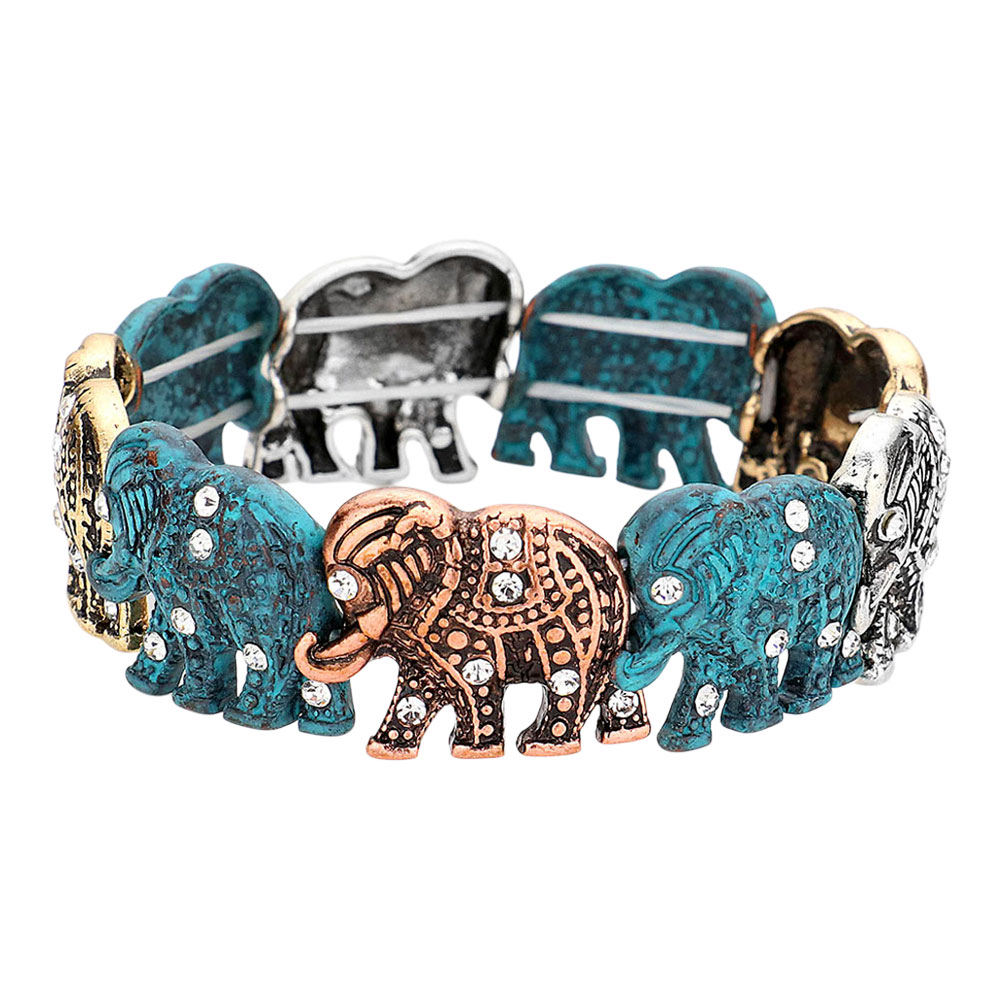 Details • Size : 0.75" H • Stretchable • Charming stretch bracelet featuring linked elephant motifs with engraved accents, symbolizing luck and strength. A unique accessory that adds personality and boho flair to any look, perfect for gifting or wearing as a meaningful everyday statement piece. • Lead and Nickel Compliant