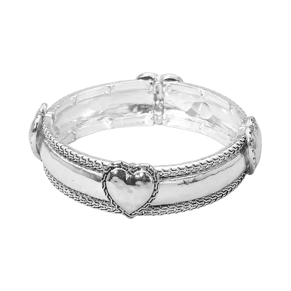 Details • Size : 0.75" H • Stretchable • Showcase timeless charm with this heart accent stretch bracelet featuring textured detailing and framed heart motifs. Designed with a flexible slip-on fit for easy comfort, it pairs effortlessly with casual or dressy looks and makes a thoughtful everyday accessory or gift. • Lead and Nickel Compliant