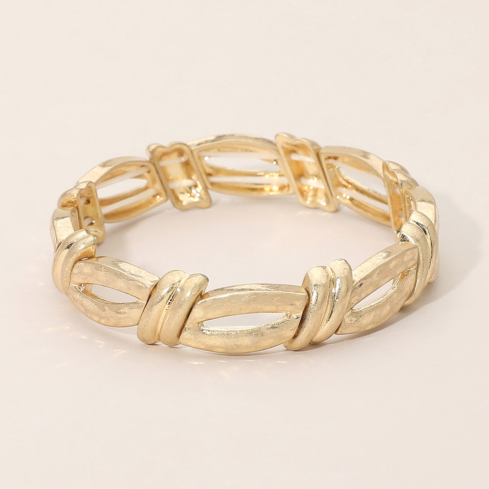 • Sleek stretch bracelet designed with repeating open links and smooth wrapped accents for a bold yet refined look. The flexible slip-on fit offers comfort and easy wear, making it ideal for everyday styling or statement layering. A versatile accessory that adds modern structure and effortless polish to any outfit.
