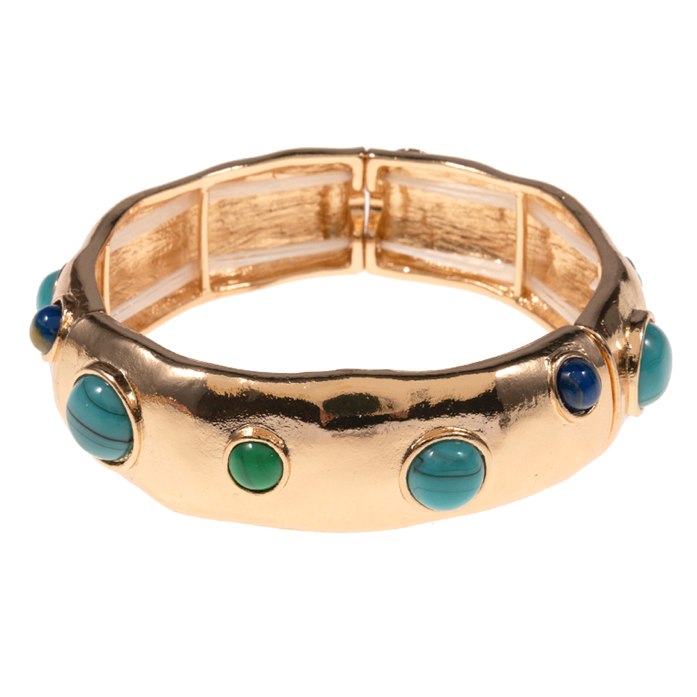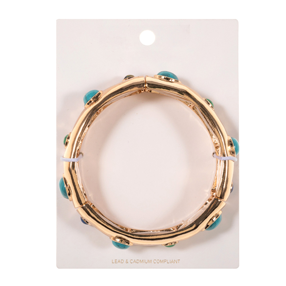 Details • Size : 0.75" h • Stretchable • This textured stretch bangle bracelet features a bold rounded silhouette accented with smooth cabochon-style details for a modern statement look. Designed for easy slip-on wear and comfortable fit, it adds dimension and shine to everyday outfits. Perfect for stacking or wearing solo, this bracelet brings fashion-forward appeal to casual and dress-ready styles alike. • Lead and Nickel Compliant