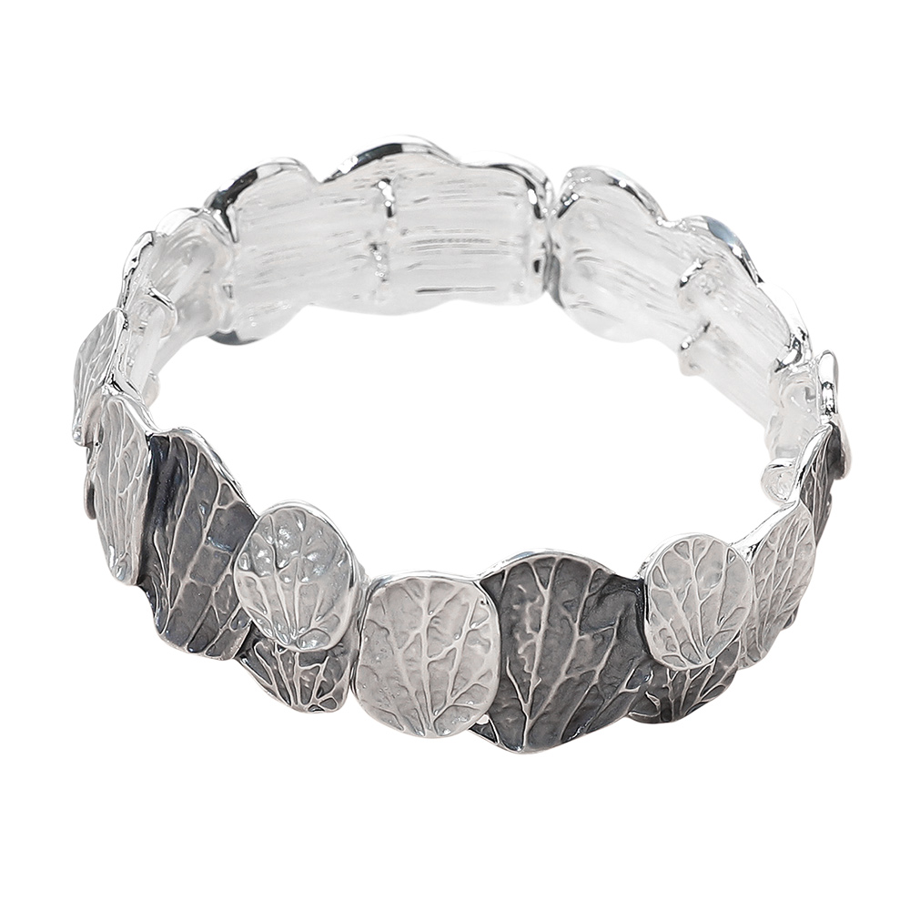 • Stylish stretch bracelet featuring textured leaf shapes in a mix of finishes. A bold yet nature-inspired accessory perfect for everyday wear or adding flair to your outfit.