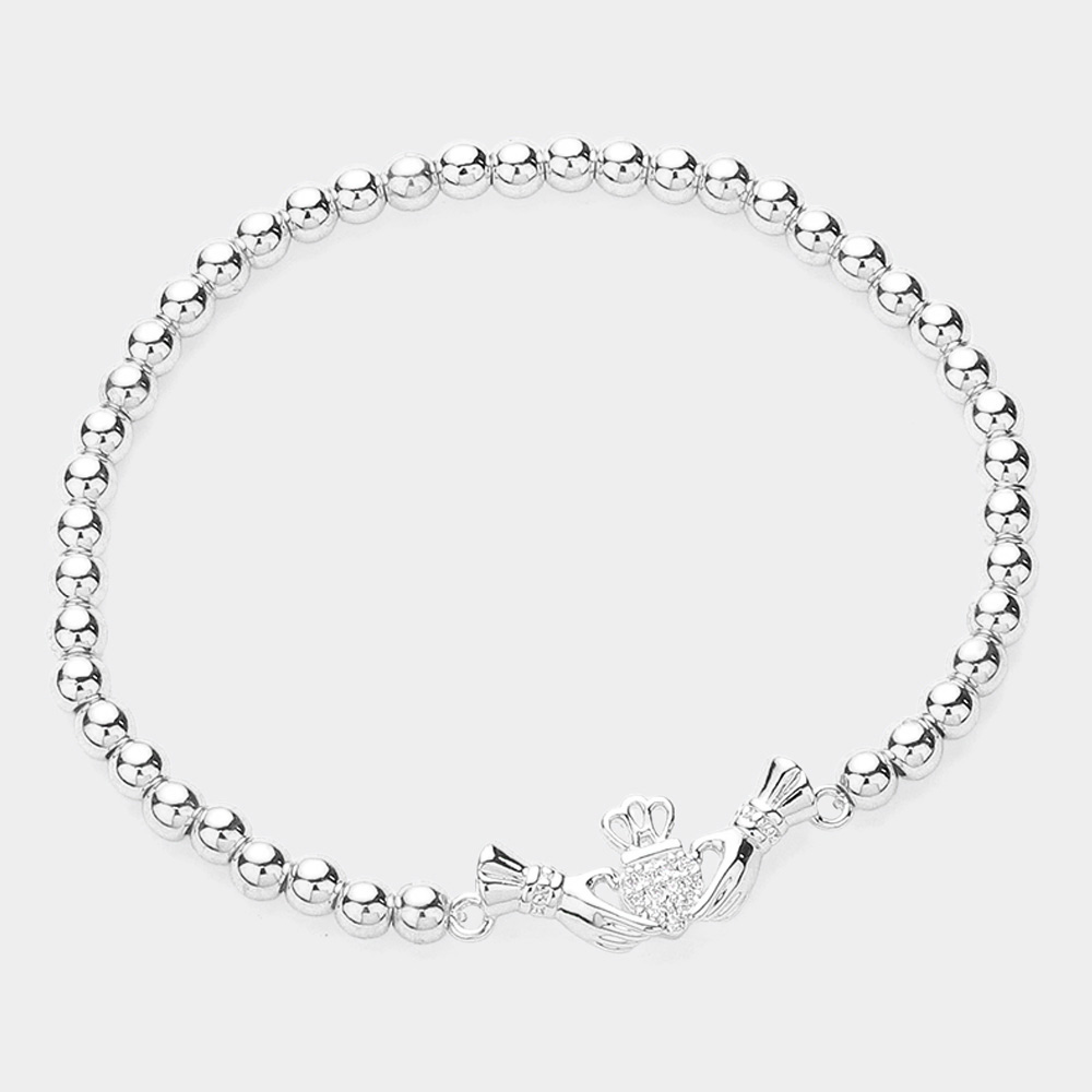 CZ Stone Paved Irish Claddagh Pointed Stainless Steel Ball Beaded Stretch Bracelet