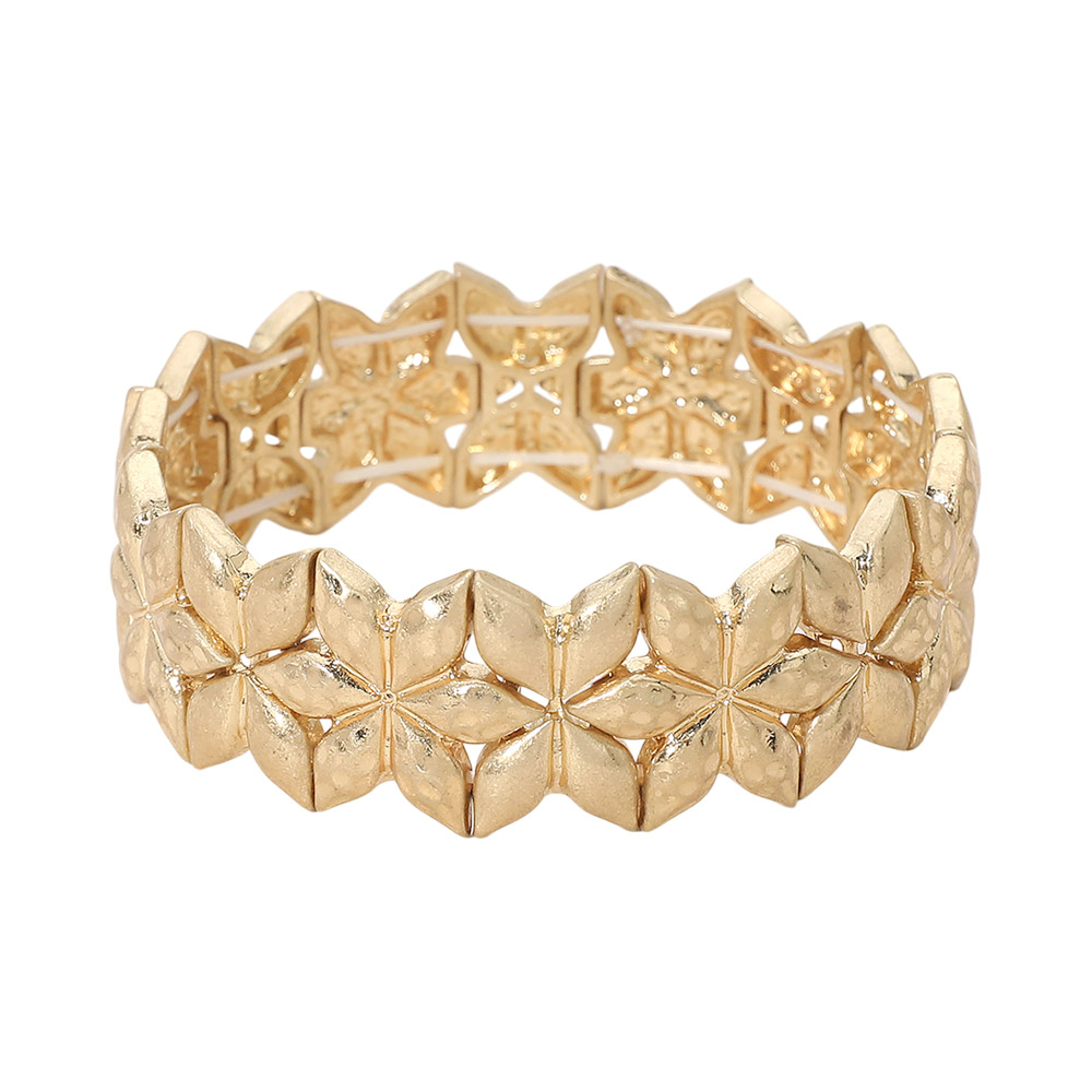 Details • Size : 0.8" H • Stretchable • Statement stretch bracelet designed with repeating geometric floral-inspired links that create bold dimension and texture. Features a flexible slip-on fit for easy wear and comfort. Ideal for stacking or wearing alone, this bracelet elevates everyday looks while adding sculptural detail and modern elegance. • Lead and Nickel Compliant