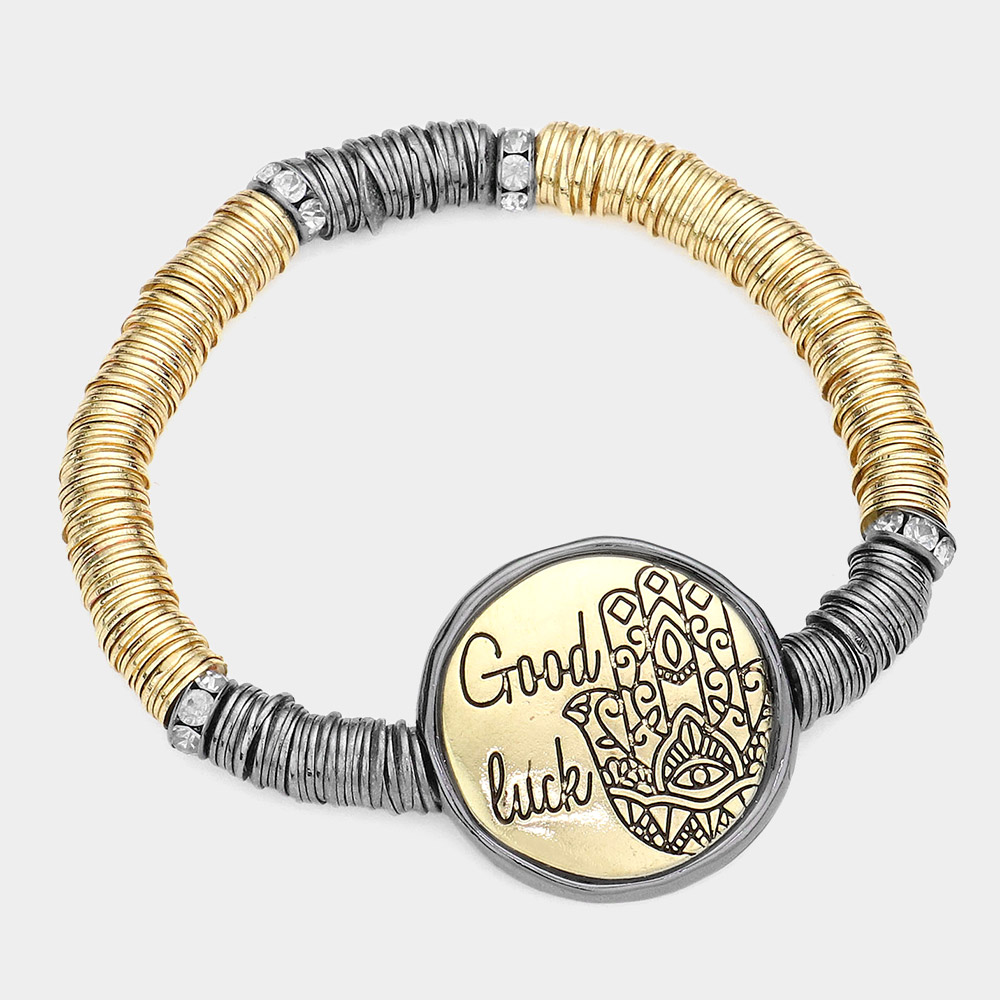 "Good luck" Evil Eye Hamsa Hand Flat Metal Bead Cluster Stretch Bracelet