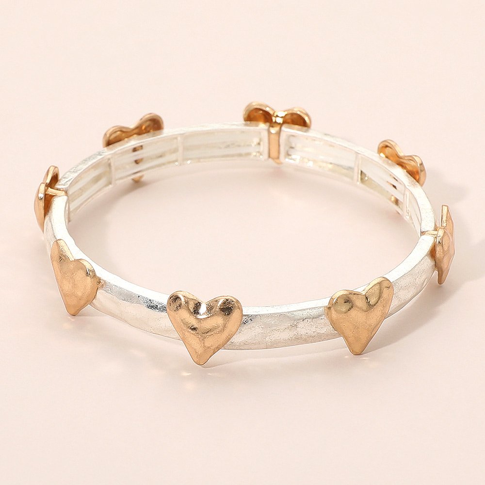 • A stylish stretch hammered brushed metal bracelet featuring raised heart accents that bring a playful, modern touch to any look. Its flexible design ensures an easy, comfortable fit while adding a sweet statement to casual or dressed-up outfits. Perfect for gifting or completing your jewelry collection.