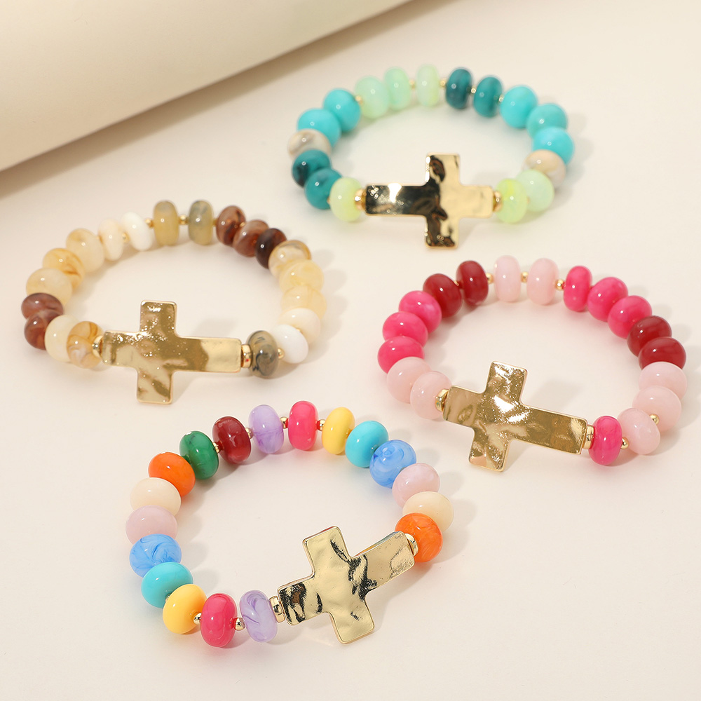 Details • Size : 1" H • Stretchable • Colorful beaded stretch bracelet featuring glossy round beads and a bold cross charm centerpiece. Comfortable and stylish, this bracelet makes a meaningful accessory for everyday wear or as a thoughtful gift. • Lead and Nickel Compliant