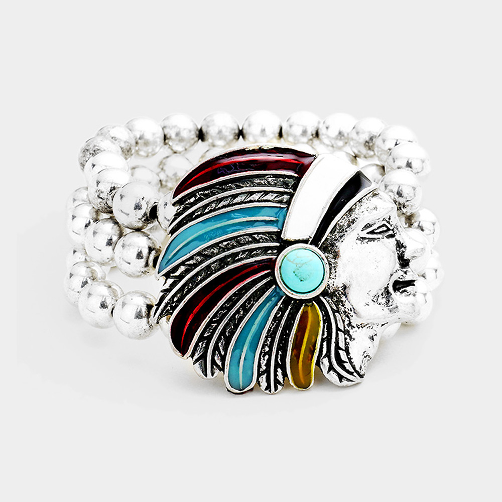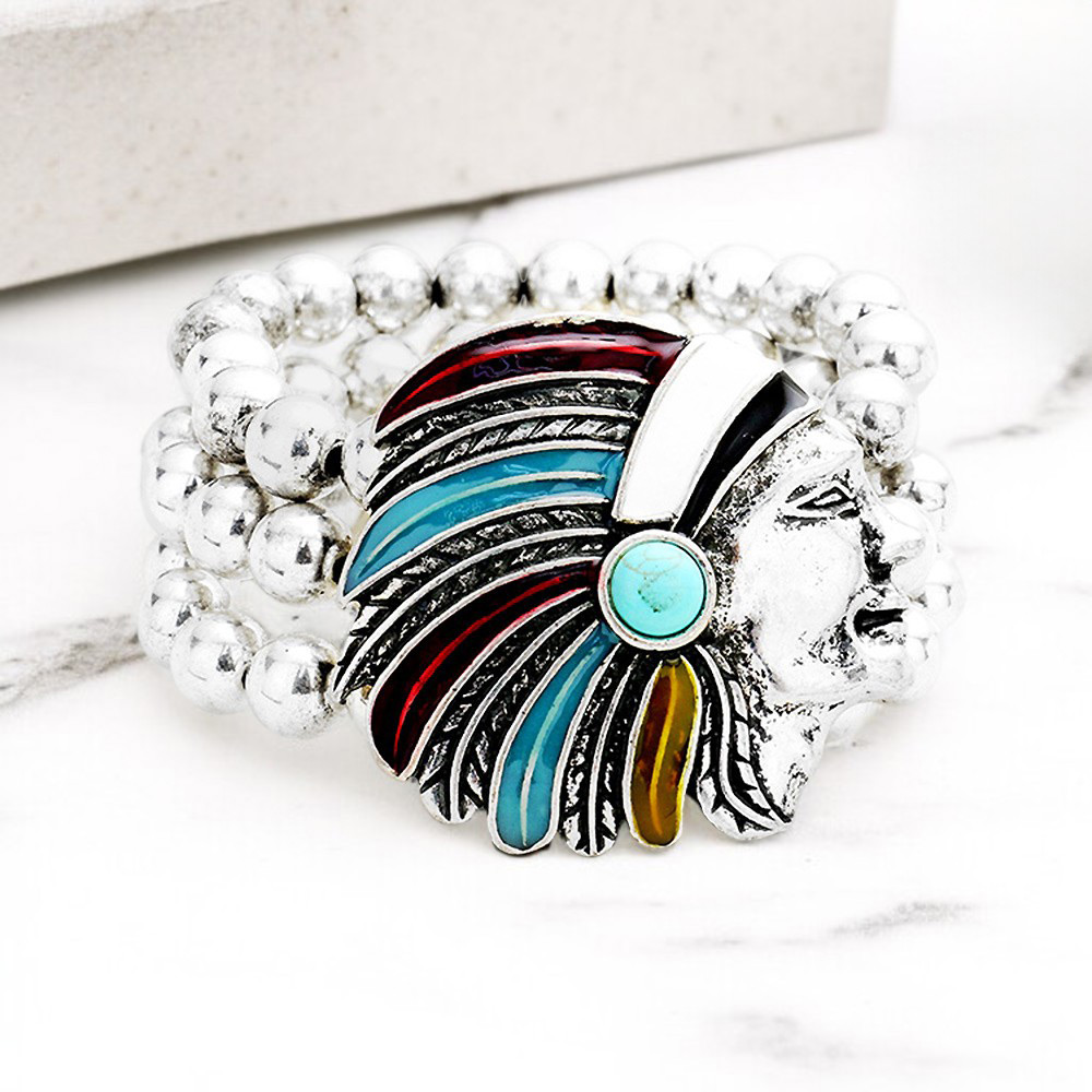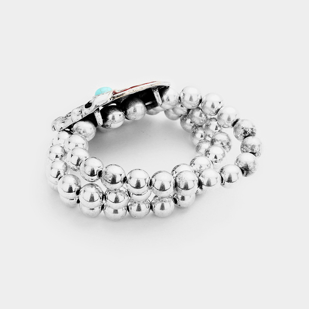 Hammered Polished Metal Cross Accent Resin Flat Disc Beaded Stretch Bracelet