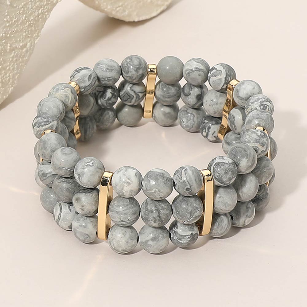 Details • Size : 1" H • Stretchable • Stylish multi row stretch bracelet designed with round beads and sleek spacer accents for a balanced, layered look. Easy slip-on fit offers comfort and flexibility for everyday wear. A versatile accessory ideal for casual outfits, boutique collections, stacking styles, and giftable fashion jewelry displays. • Lead and Nickel Compliant