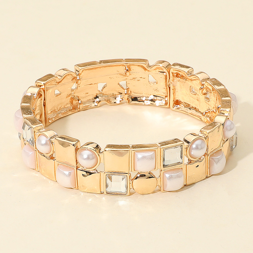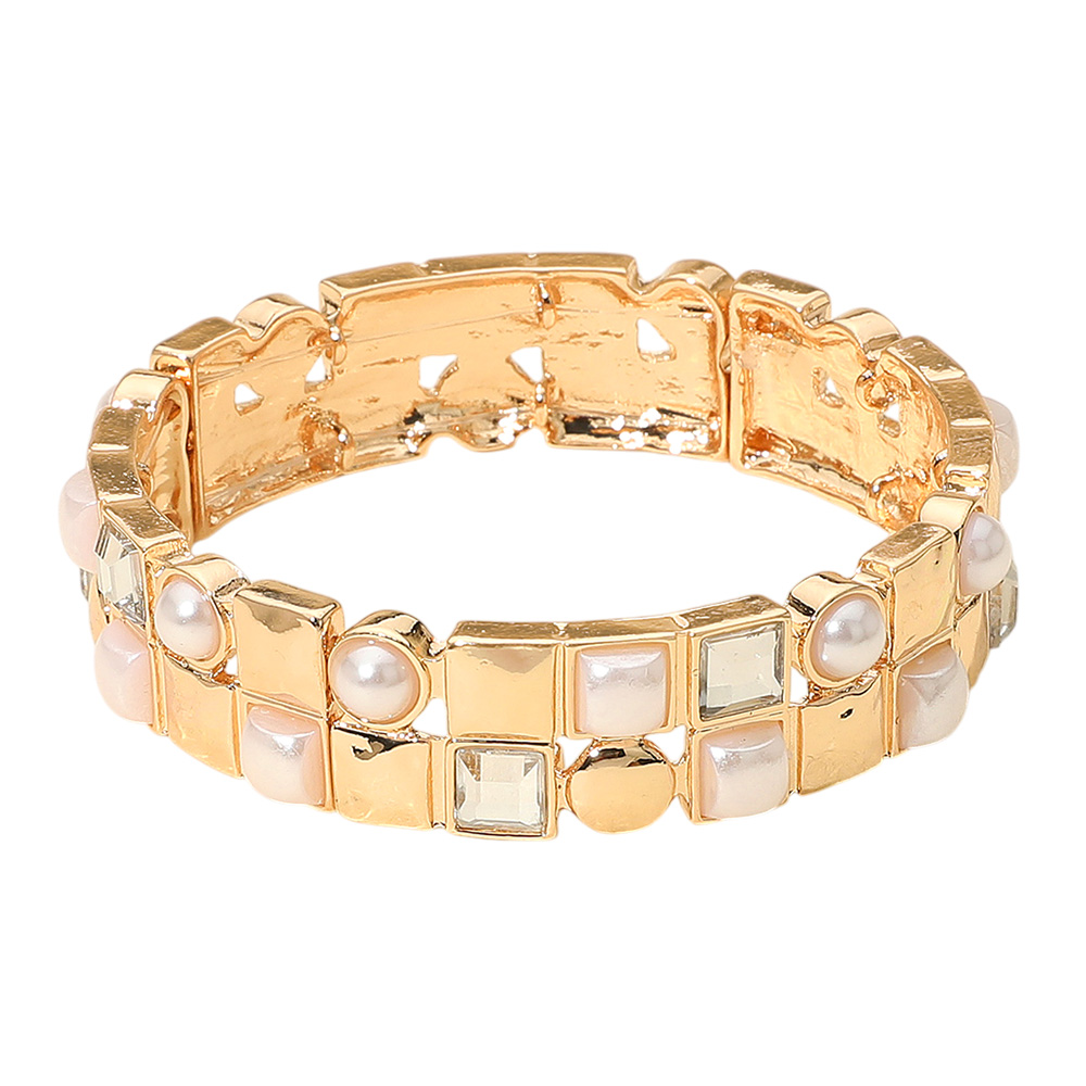 Details • Size : 0.7" H • Stretchable • Add sophistication to your look with this geometric embellished bracelet featuring a mix of polished shapes and luminous accents. Its bold design blends classic charm with modern flair, making it the perfect accessory for both casual wear and elegant occasions. • Lead and Nickel Compliant