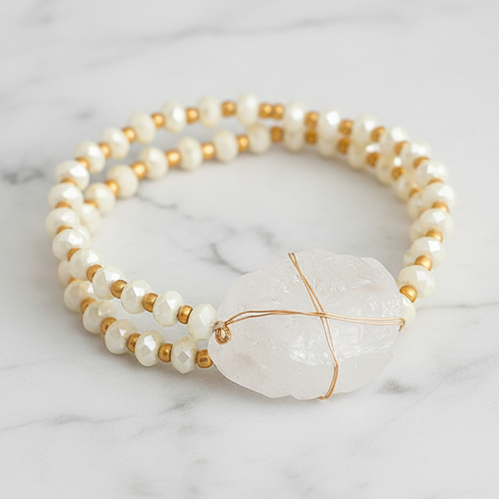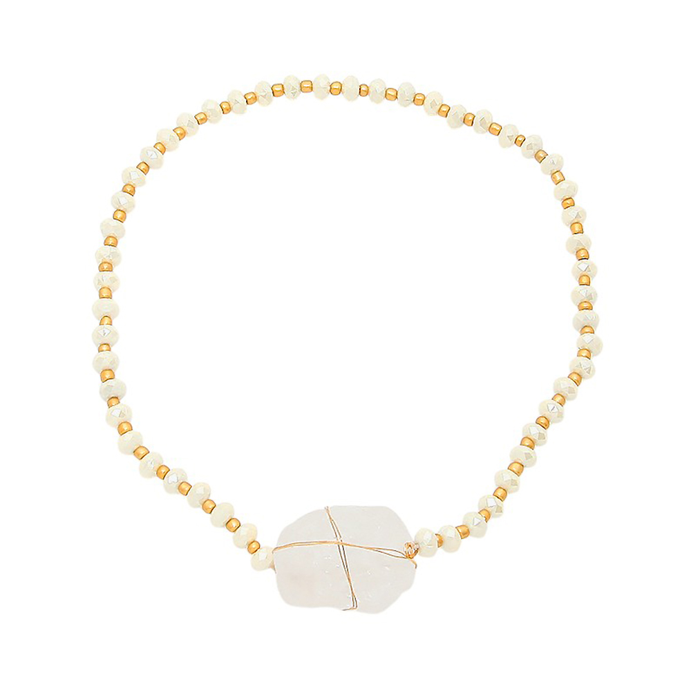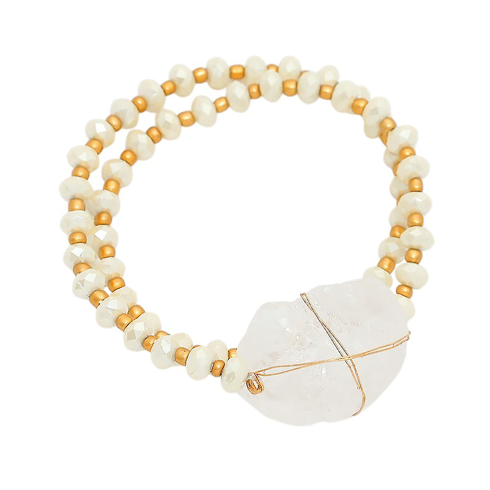 Marbled Oval Pearl Stone Accent Hammered Metal Beaded Stretch Bracelet