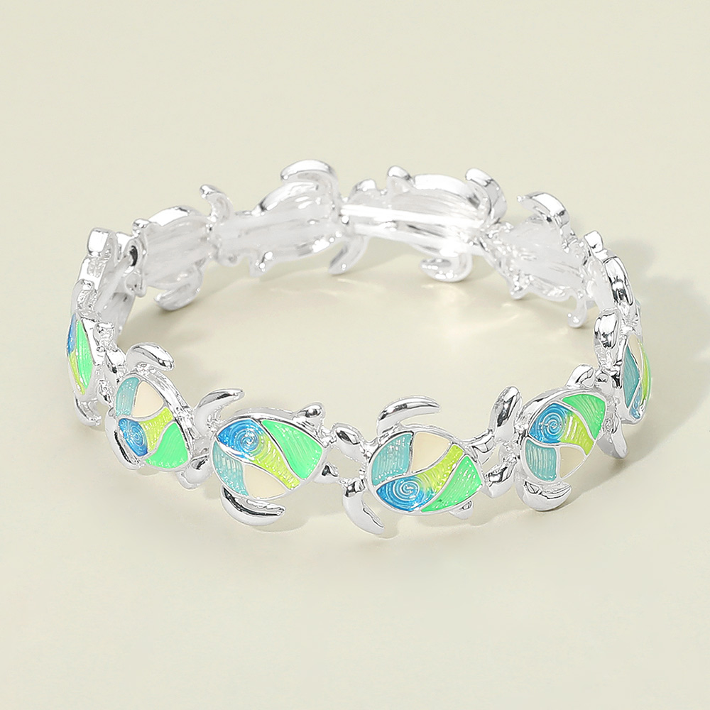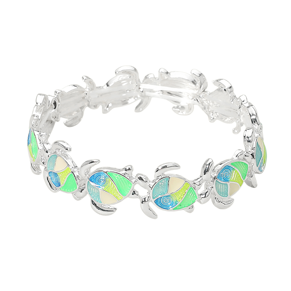 • Sea turtle stretch bracelet featuring repeating turtle motifs with smooth linked detailing for a playful yet polished look. Designed for easy wear and everyday styling, this bracelet adds a coastal-inspired accent to casual outfits, vacation assortments, or gift-ready collections. A great choice for boutiques seeking charming, trend-forward accessories with broad customer appeal.