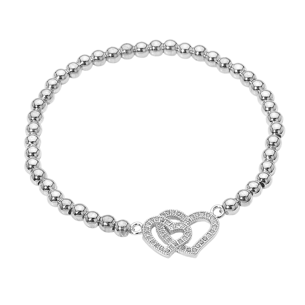 Stainless Steel CZ Stone Paved Interlocking Heart Beaded Stretch Bracelet