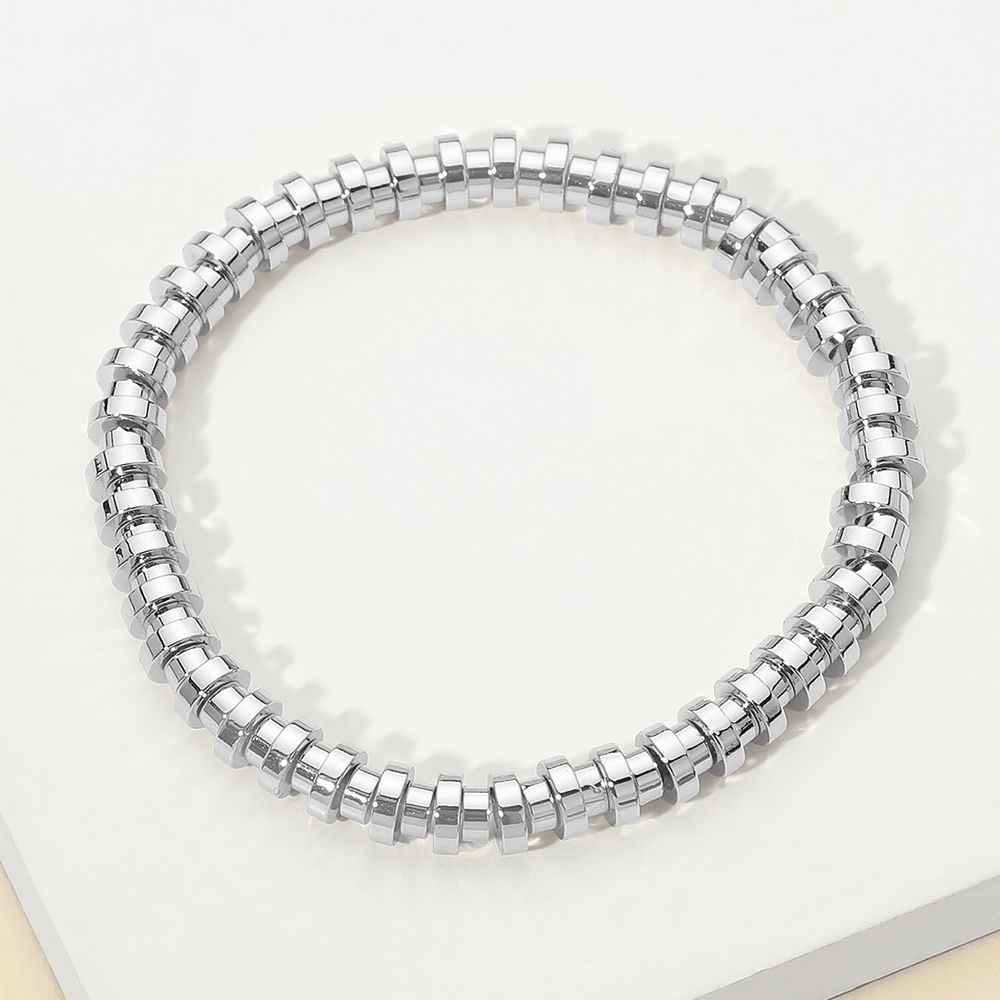 • This stainless steel flat disc bead stretch bracelet features sleek, evenly spaced flat beads that create a clean, modern look with effortless wear. Designed with a flexible slip-on fit, it offers everyday comfort and easy styling. Perfect for stacking or wearing solo, this bracelet complements casual and polished outfits alike, making it a versatile addition to curated accessory collections and gift-ready assortments.
