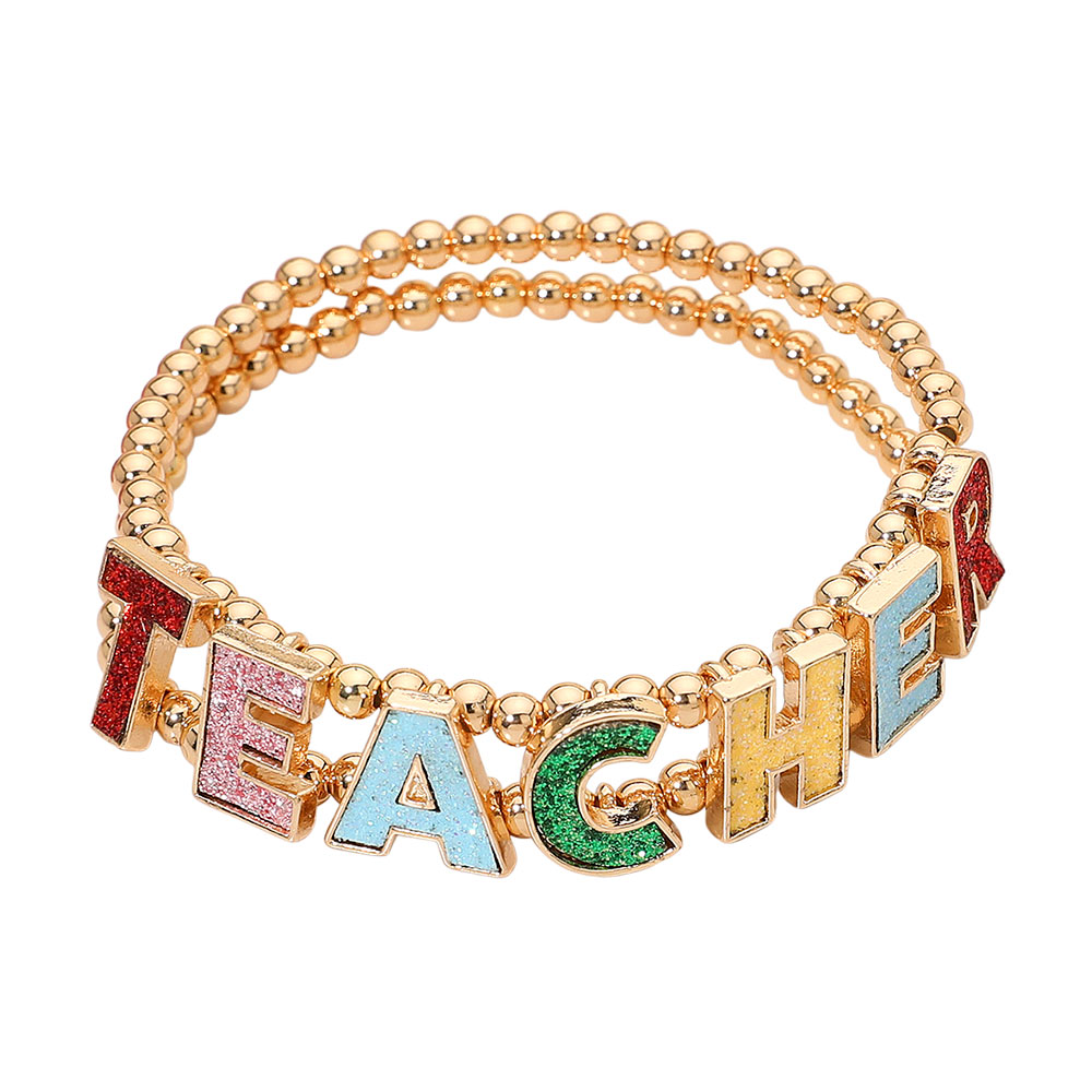 Details • Size : 0.5" H • Stretchable • A cheerful bracelet featuring bold letter charms spelling “TEACHER” on a stretch-bead design that slips on easily for everyday wear. Perfect as a thoughtful gift for educators, classroom celebrations, appreciation events, or casual accessorizing. • Lead and Nickel Compliant