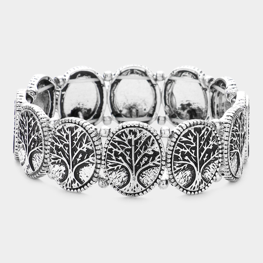 Stainless Steel CZ Stone Paved Tree Of Life Accent Hinged Bangle Bracelet
