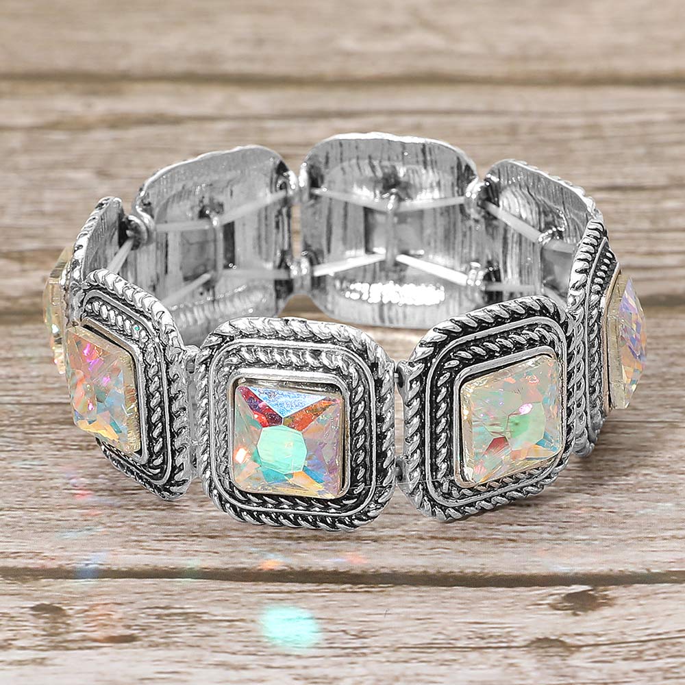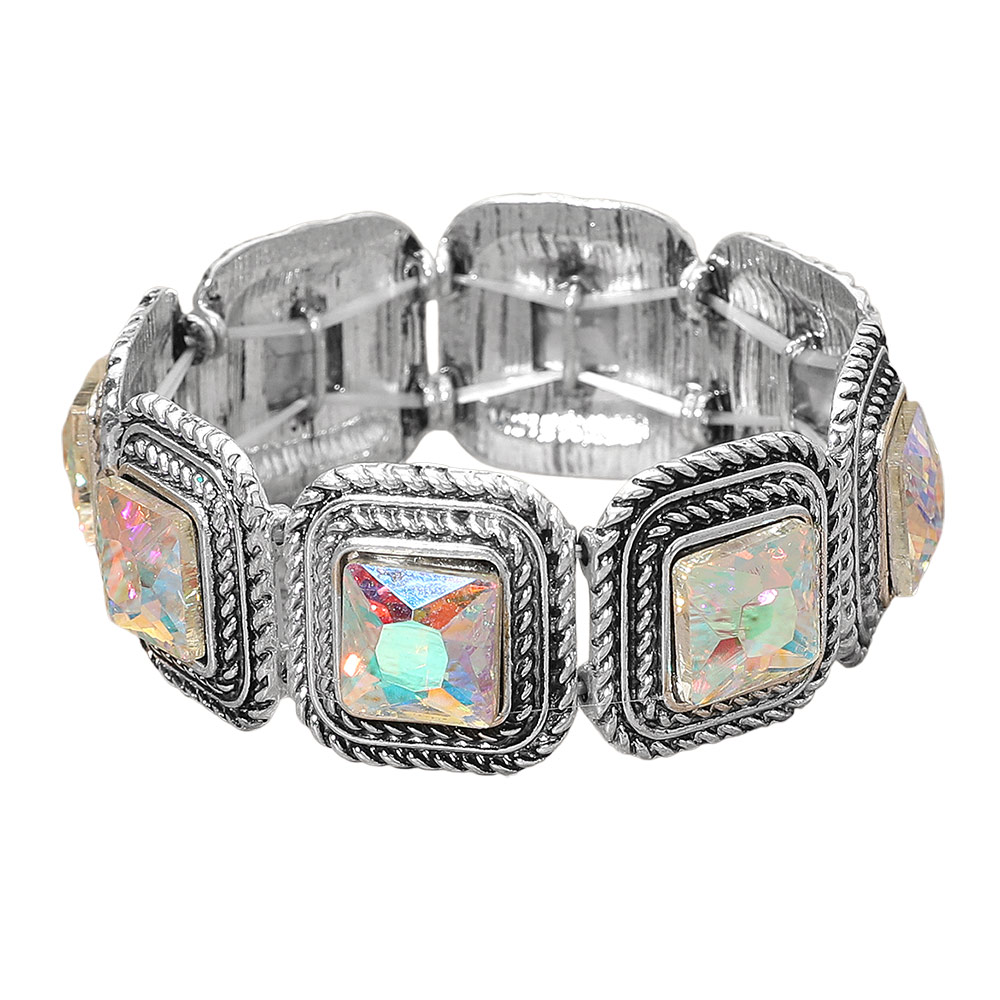 Details • Size : 1" H • Stretchable • Add timeless elegance to your style with this vintage-inspired stretch bracelet featuring square-cut crystals framed in intricate detailing. Designed for comfort and shimmer, it enhances any outfit with radiant light reflections — perfect for parties, events, or elevating everyday looks. • Lead and Nickel Compliant