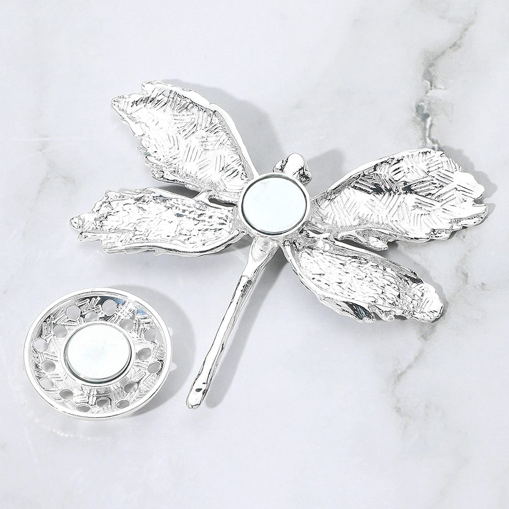 Details • Size : 3.5" X 3.25" • Magnetic Closure • No Pinhole Damage • Add a whimsical touch to your look with this dragonfly enamel brooch pin, featuring beautifully detailed wings and a sleek metallic body. Perfect for accessorizing jackets, scarves, or bags, this pin captures the delicate charm of nature with artistic craftsmanship and style. • Lead and Nickel Compliant