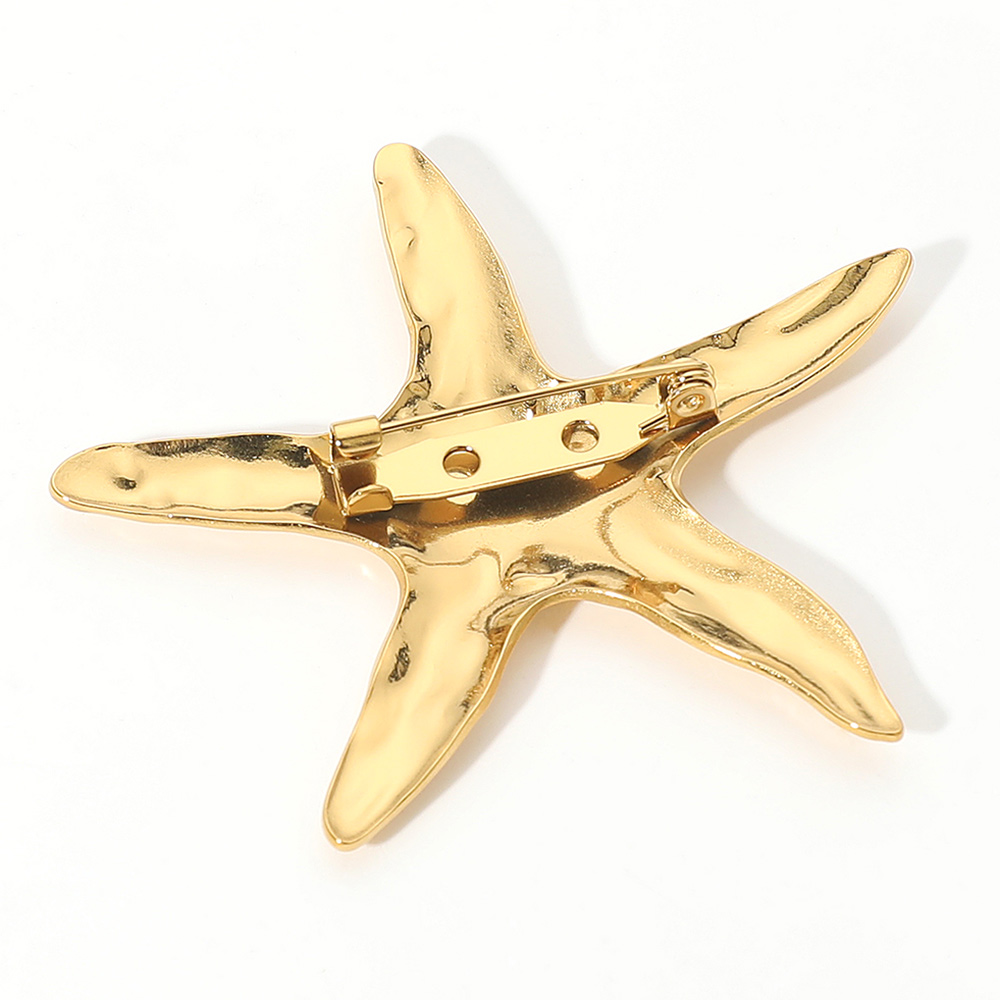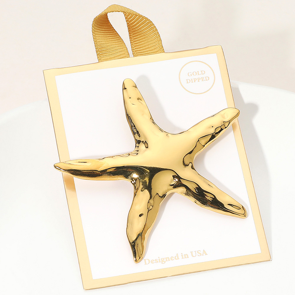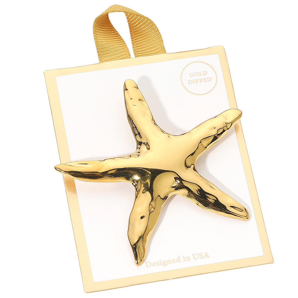 Details • Size : 2.5" X 2.5" • Pin Brooch • Statement starfish brooch featuring a smooth, sculpted silhouette inspired by coastal elements. A striking accessory perfect for jackets, scarves, dresses or bags, adding artistic seaside charm and standout elegance to both special occasions and everyday style. • Gold Dipped • Lead and Nickel Compliant