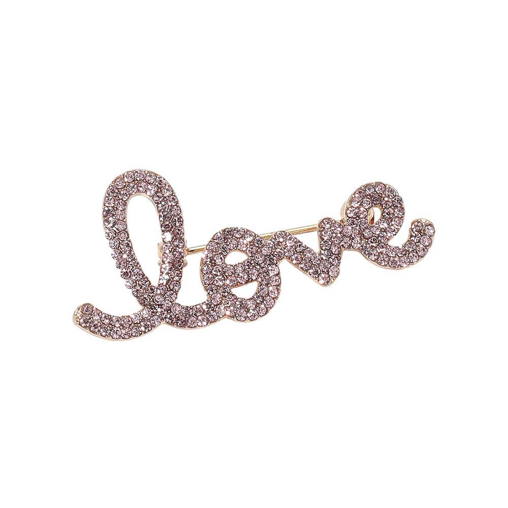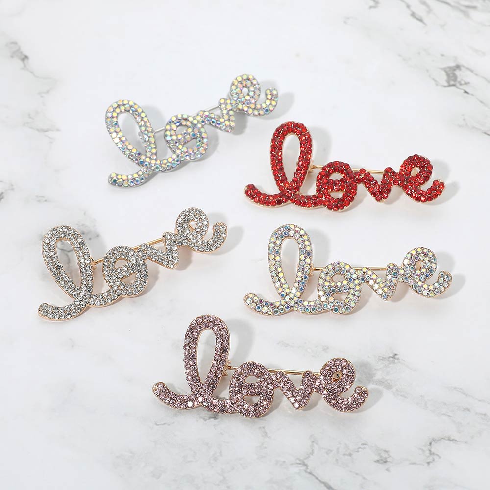 Details • Size : 2.2" X 0.9" • Pin Brooch • Stylish script love brooch featuring sparkling crystal accents for a meaningful statement look. Ideal for adding charm to jackets, dresses, scarves, hats, or bags, this versatile accessory brings a romantic touch to everyday outfits and special occasion styling. • Lead and Nickel Compliant