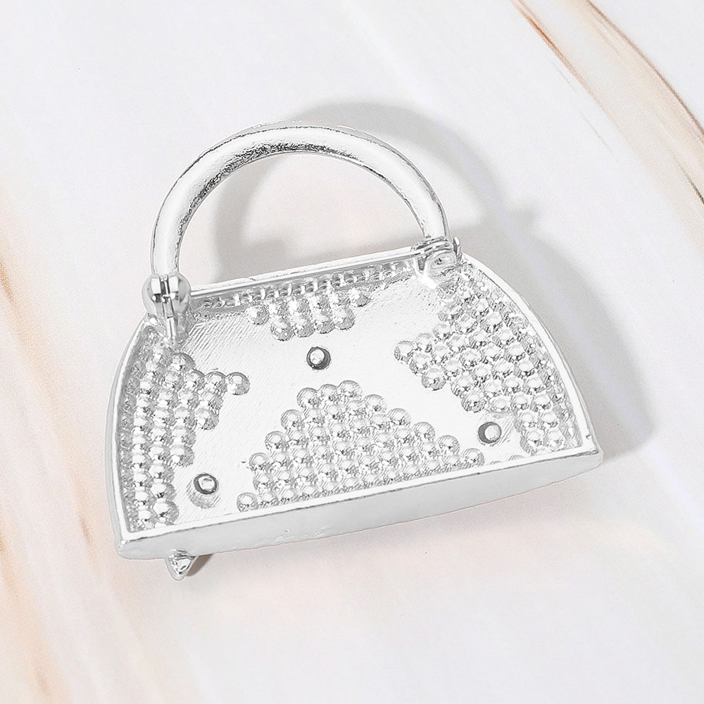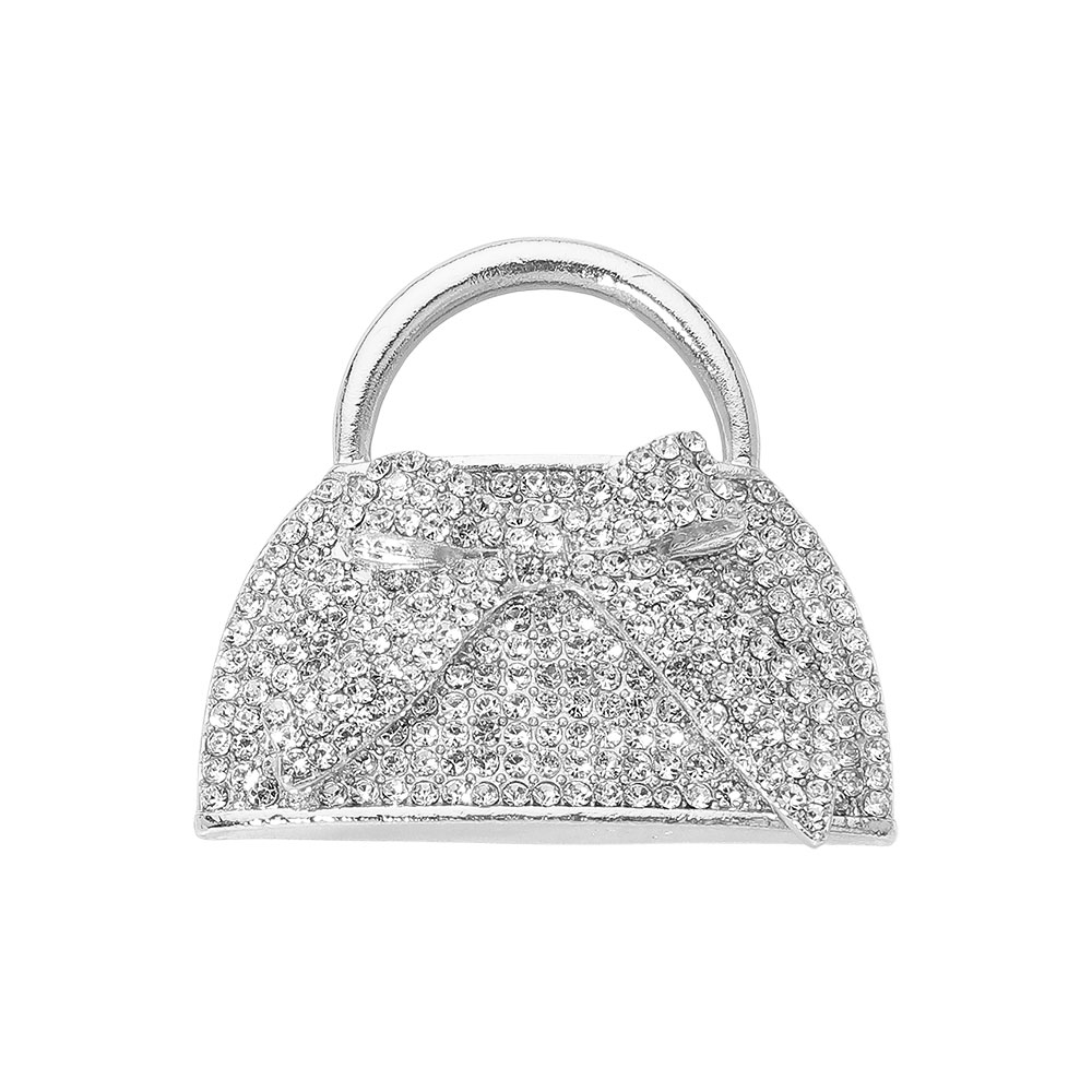 Details • Size : 2" X 1.8" • Pin Brooch • This brooch features a sparkling handbag silhouette accented with a radiant bow, offering a refined touch of glamour. Its shimmering finish creates an elegant statement, making it an ideal accessory for enhancing both everyday looks and special occasion outfits. • Lead and Nickel Compliant