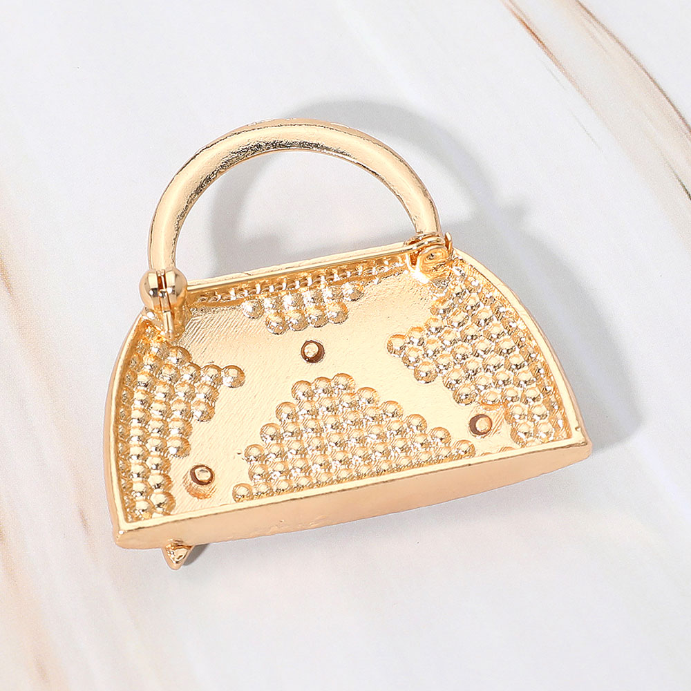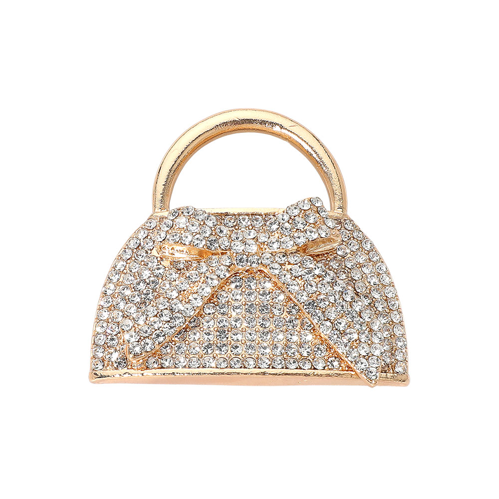 • This brooch features a sparkling handbag silhouette accented with a radiant bow, offering a refined touch of glamour. Its shimmering finish creates an elegant statement, making it an ideal accessory for enhancing both everyday looks and special occasion outfits.