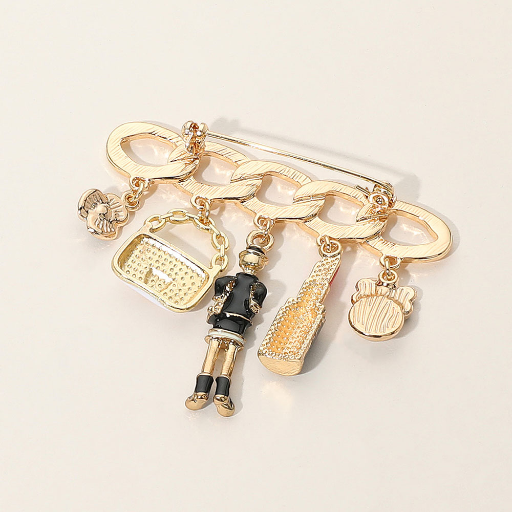 Details • Size : 2.4" X 1.9" • Pin Brooch • Showcase your unique style with this Fashion Charm Brooch featuring miniature lipstick, handbag, and pearl accents. Designed with a chic chain-link base, this playful yet elegant accessory adds a touch of glamour to jackets, bags, or scarves for a stylish finish.