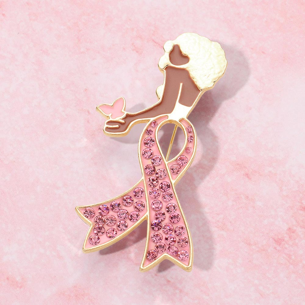 Details • Size : 1.25" X 2.5" • Pin Brooch • This empowering ribbon brooch features a radiant female figure holding a butterfly, beautifully paired with a sparkling awareness ribbon. A meaningful symbol of strength, hope, and transformation—perfect for honoring journeys, spreading awareness, and making a heartfelt statement. • Lead and Nickel Compliant