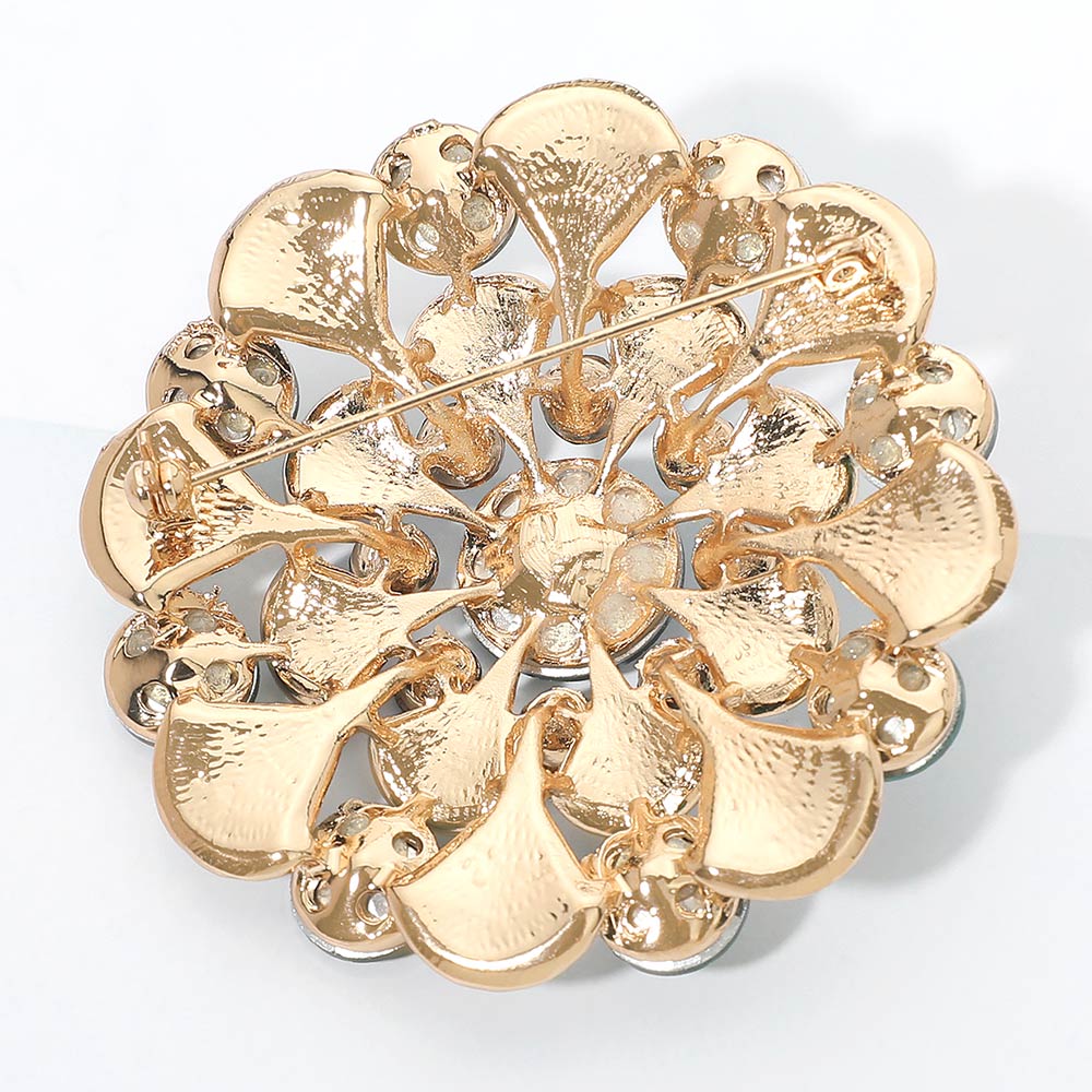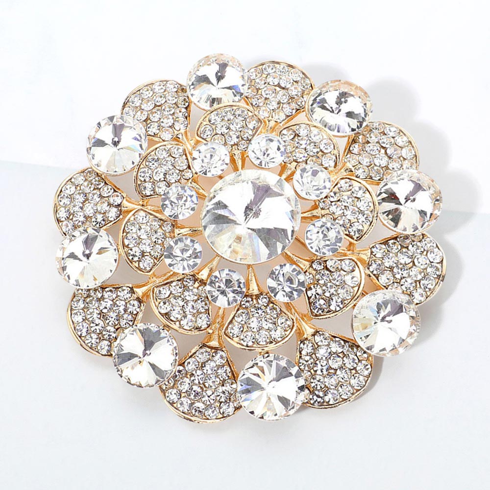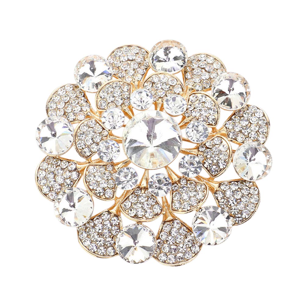 Details • Size : 3" X 3" • Pin Brooch • This stunning round crystal flower brooch features layered gem accents that create a dazzling floral design. Perfect for elevating any outfit, it adds a touch of vintage-inspired glamour and refined brilliance to jackets, scarves, or formal attire. • Lead and Nickel Compliant