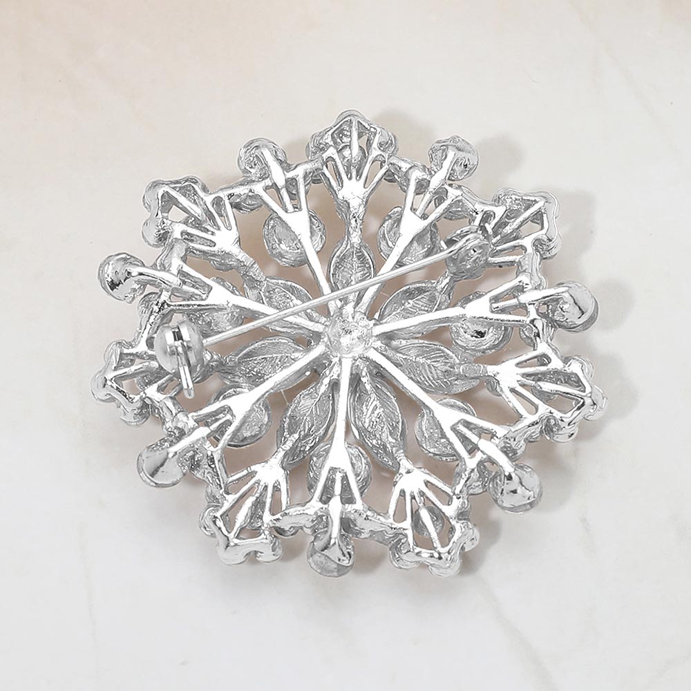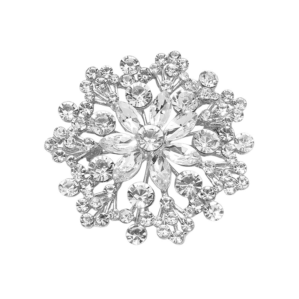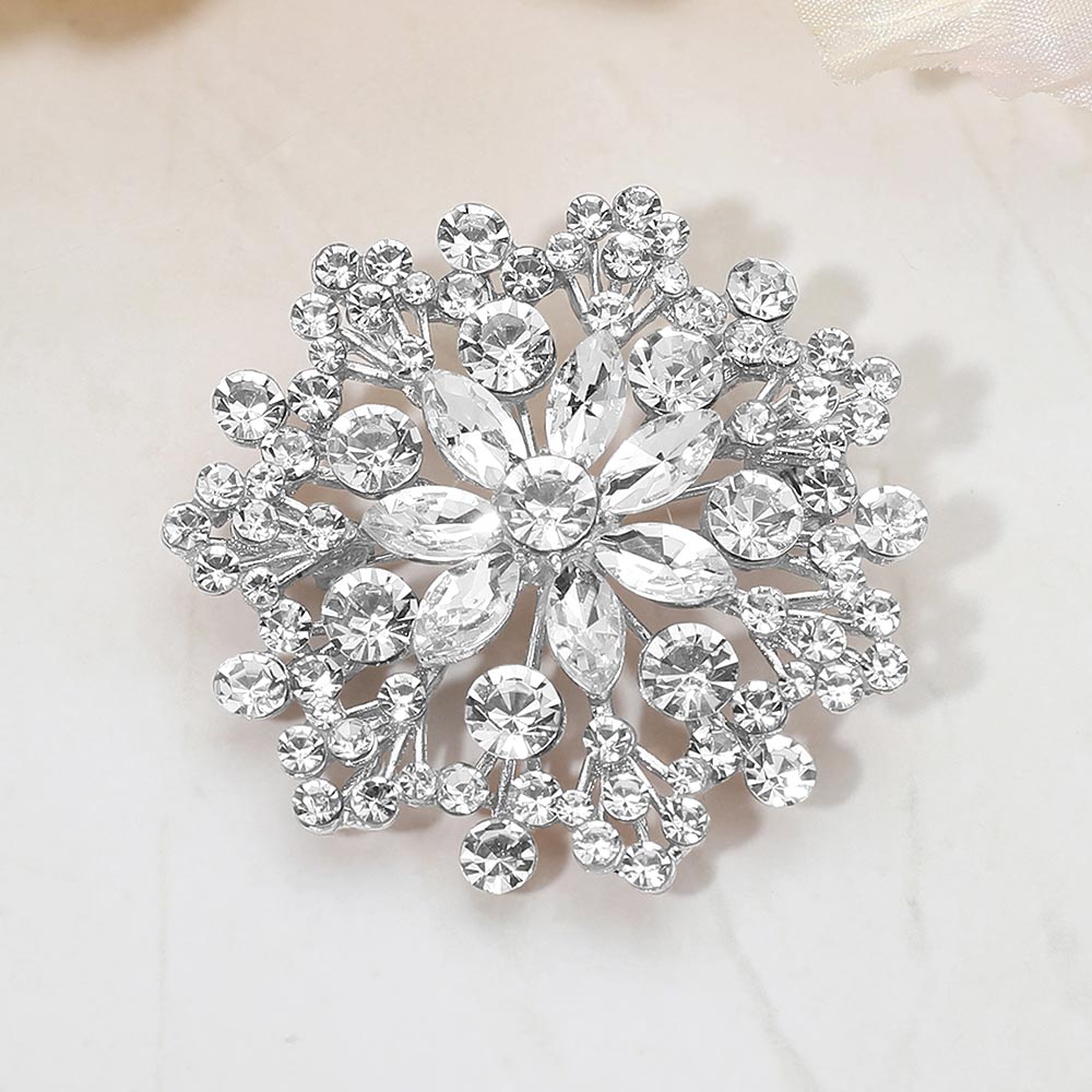 Details • Size : 2" X 2" • Pin Brooch • Eye-catching floral statement brooch designed with layered crystal accents arranged in a radiant cluster silhouette. This decorative pin adds elegant sparkle and dimension to jackets, scarves, dresses, and accessories, making it ideal for formal styling, seasonal collections, and fashion-forward displays. • Lead and Nickel Compliant